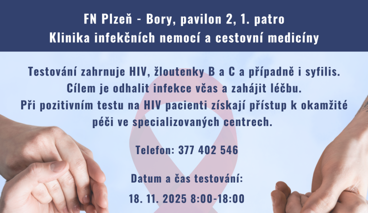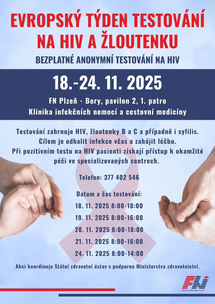 již potřetí se Klinika infekčních nemocí a cestovní medicíny FN Plzeň aktivně zapojuje do Evropského týdne testování na HIV a žloutenky, a to v období od 18. 11. do 24. 11. 2025. Záměrem je upozornit na problematiku HIV bez stigmatizace. Zájemci mohou využít anonymní testování na HIV, hepatitidu B a C a případně i syfilis. Při pozitivním testu na HIV pacienti získají přístup k okamžité péči ve specializovaných centrech. Vše je hrazeno z veřejného zdravotního pojištění.