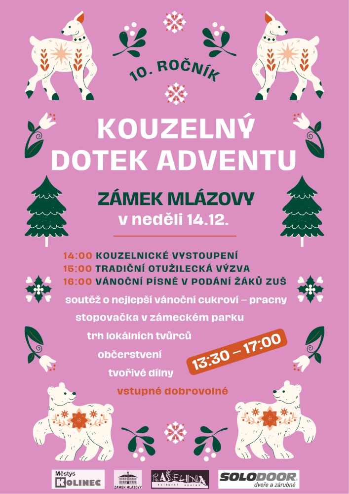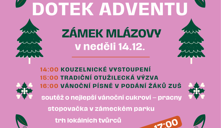 Zámek Mlázovy zve na 10. ročník akce Kouzelný dotek adventu na zámku Mlázovy. Na programu bude kouzelník, otužilecká výzva, adventní trhy a dílničky pro děti, zpívání vánočních písní a soutěž o nejlepší pracny. Program se převážně (kromě otužilecké výzvy v koupacím jezírku na nádvoří a stopovačky v parku) odehrává v modrém zámeckém sále, takže i nepřízeň počasí nás neohrozí. Více podrobností najdete na webu www.zamekmlazovy.cz.
