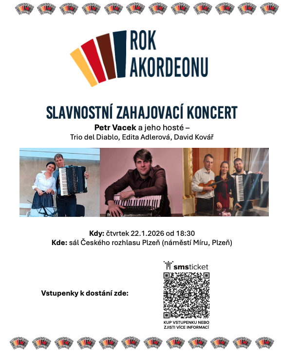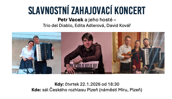 Slavnostní zahajovací koncert Roku akordeonu Vám představí zakladatele a uměleckého ředitele Accordion School Petr Vacek – pana Petra Vacka. Geniální akordeonista a skvělý akordeonový pedagog se Vám představí nejen jako sólový hráč. Představí Vám také, jak krásně může akordeon znít v kombinaci se zpěvem mezzosopranistky Edity Adlerové, v Trio del Diablo v kombinaci s klavírem a houslemi a v neposlední řadě s oduševnělým saxofonem Davida Kováře. Nenechte si ujít tento jedinečný zážitek a přijďte se k nám připojit na tomto koncertě. Těšíme se na Vás!