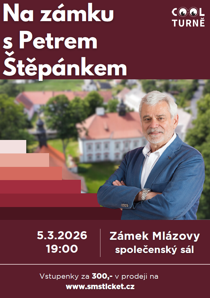 Moderovanou talkshow s Petrem Štěpánkem pořádá zámek Mlázovy. Uskuteční se na zámku 5.3.2026 od 19 hodin. Zároveň do zámecké expozice „Historie, kterou odvál čas, přesto žije dál“ s unikátní barokní černou kuchyní a navštivte také Venkovské muzeum tradičního zemědělství „Co zaseješ, to sklidíš“.