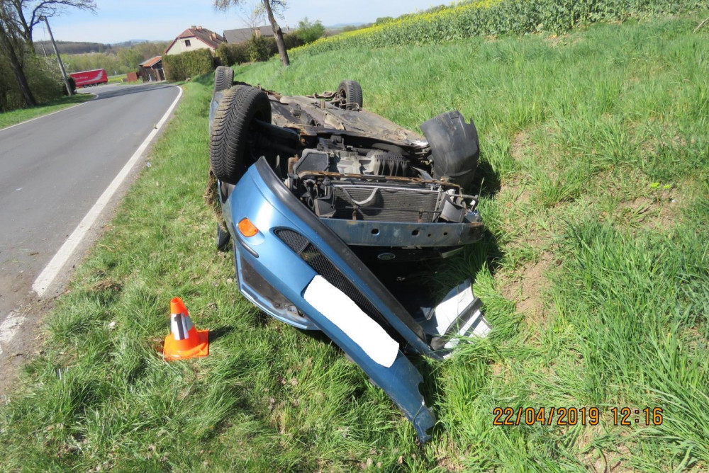 FOTO: Mladá řidička se nevěnovala řízení a vyjela ze silnice. S autem se převrátila na střechu