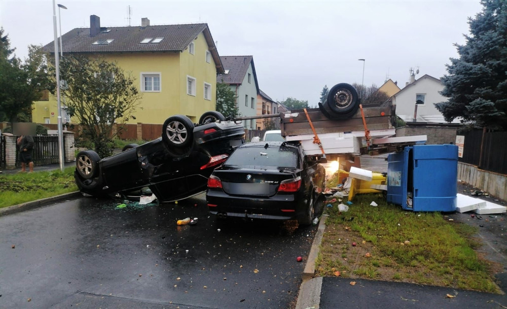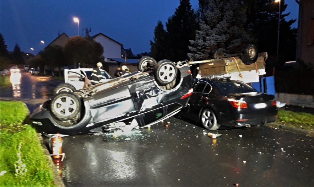 Po hrozivém střetu tří vozidel přistálo jedno z nich převrácené na střechu i s připojeným vozíkem