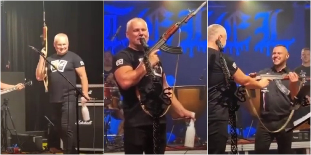 Jiří Kajínek při křtu nového alba skupiny Ortel mával na pódiu samopalem na akustické náboje