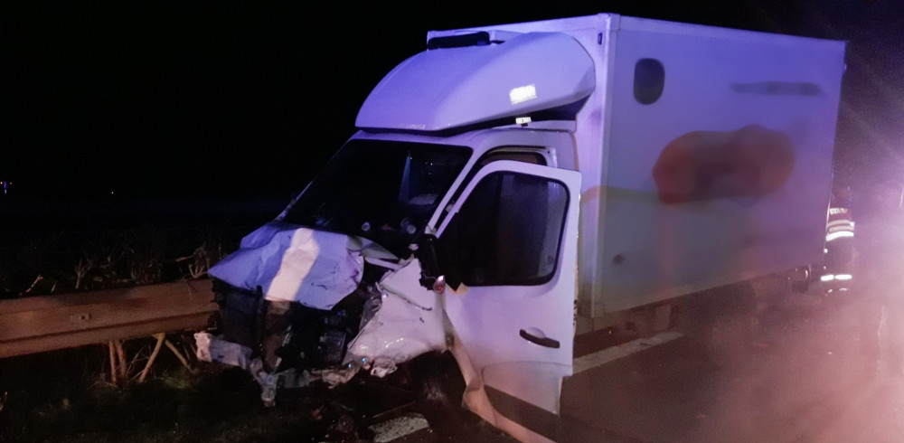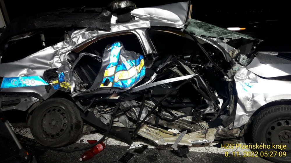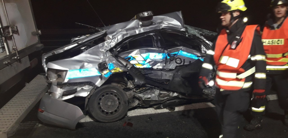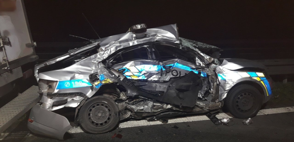 Policejní auto totálně sešrotoval při dramatické honičce u dálničního přivaděče cizinec v kradené dodávce