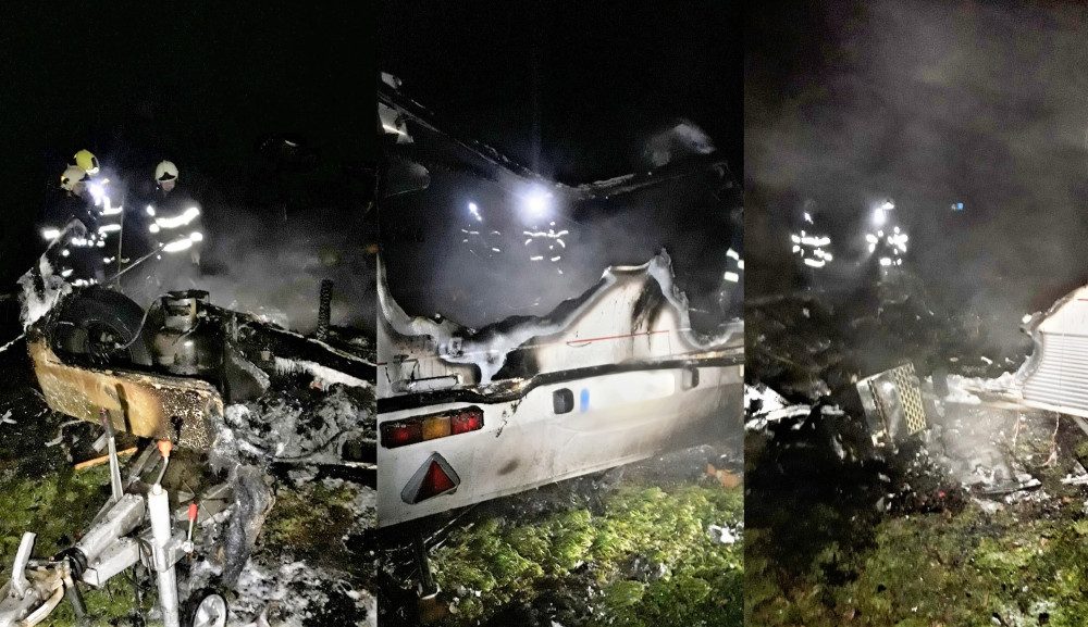 Při požáru úmyslně zapáleného karavanu se popálil jeho obyvatel. Z vozidla nezbylo skoro nic