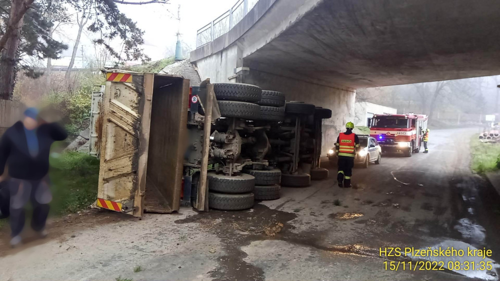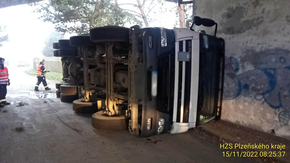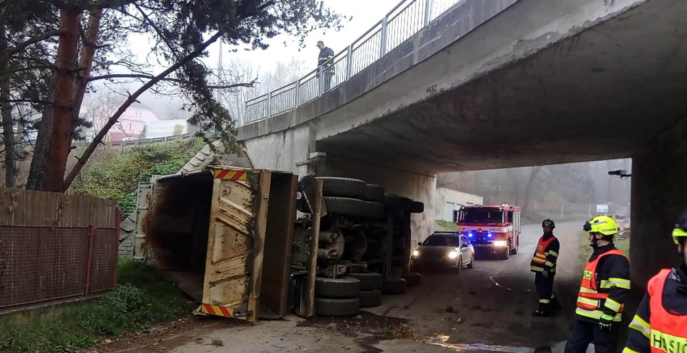 Nákladní automobil se nevešel pod most se zvednutou korbou, náraz ho převrátil na bok