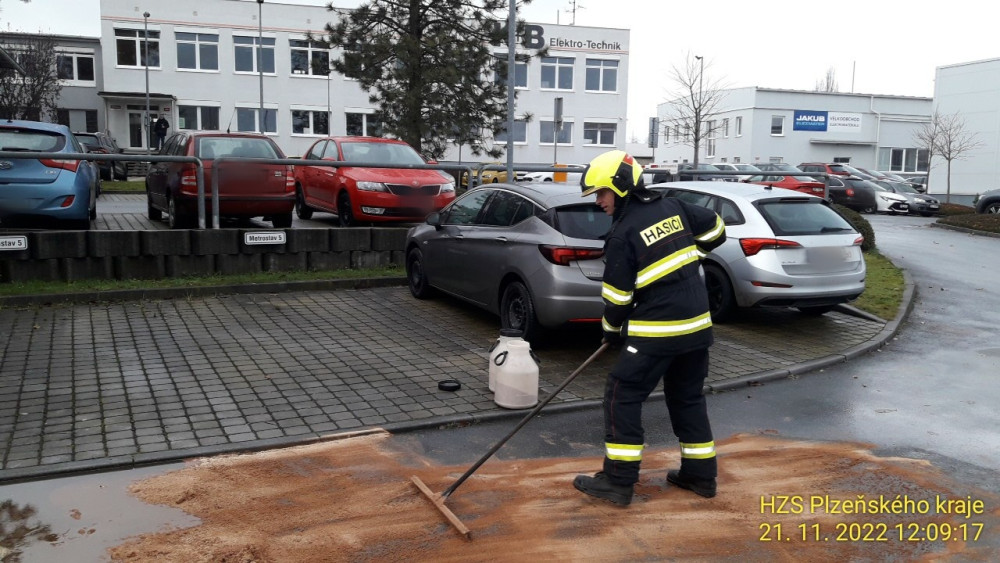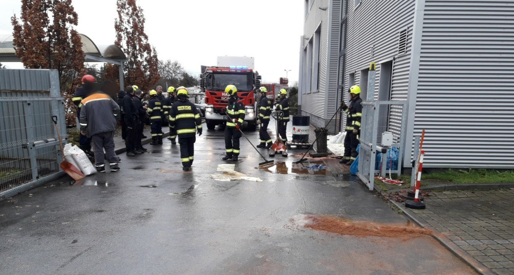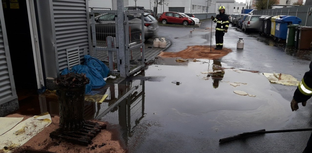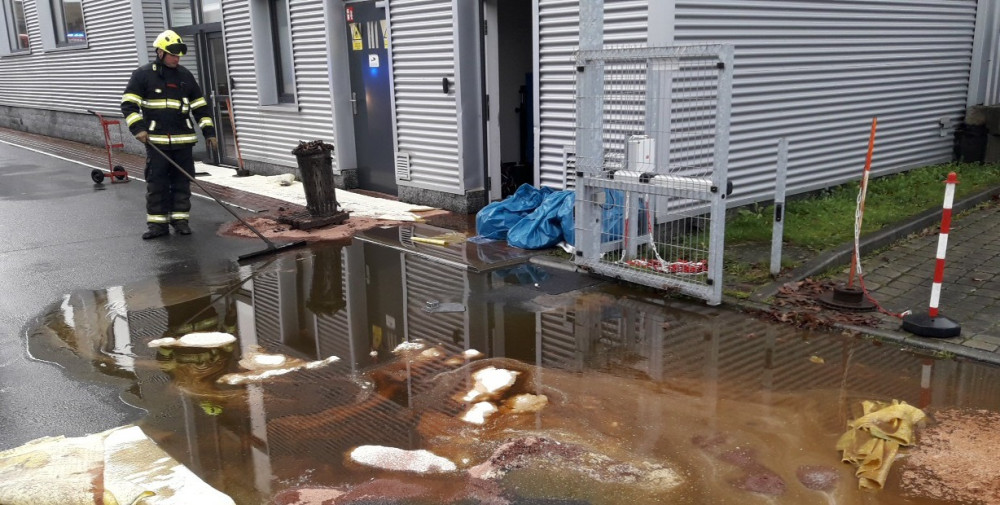 Hasiči bojují s masivním únikem motorového oleje z areálu soukromé firmy, část se dostala do kanalizace