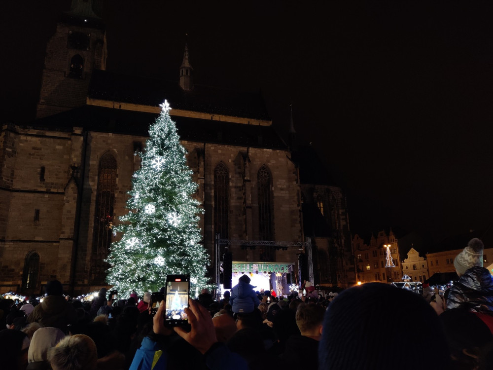 FOTO: Tisícovky lidí sledovaly rozsvícení stromu na plzeňském náměstí, vyjela i vánoční tramvaj