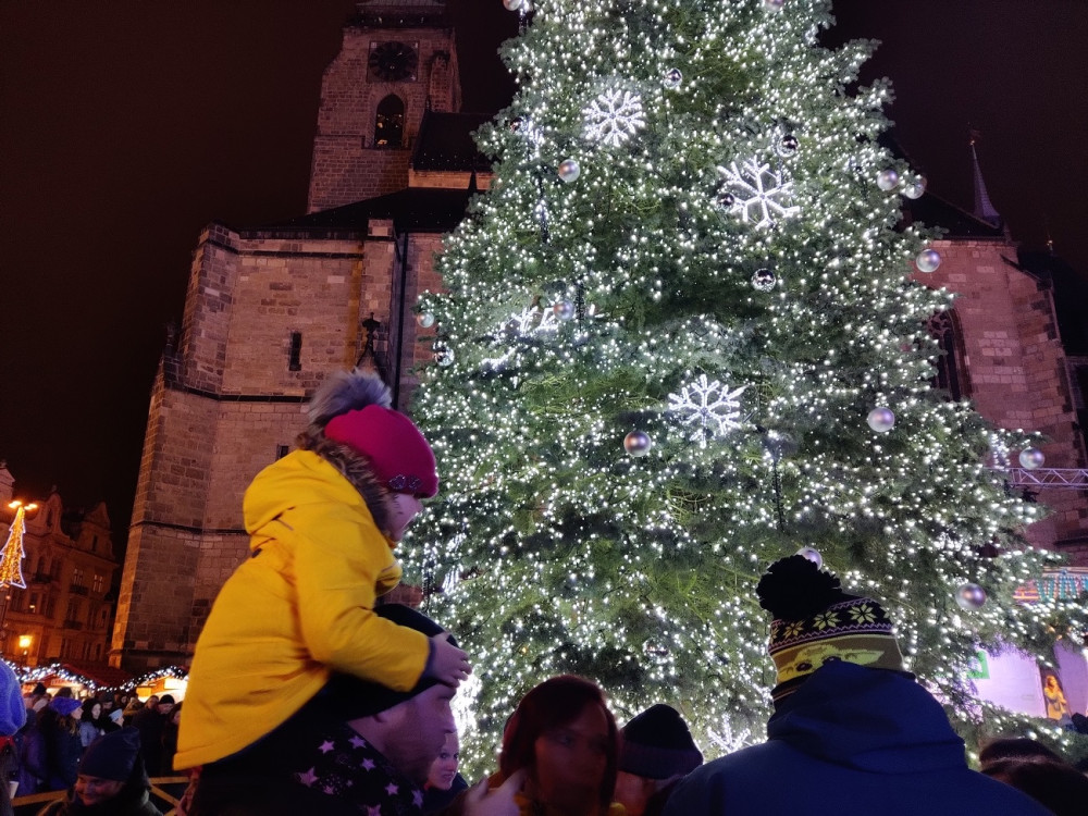 FOTO: Tisíce lidí sledovaly rozsvícení stromu na plzeňském náměstí, vyjela i vánoční tramvaj