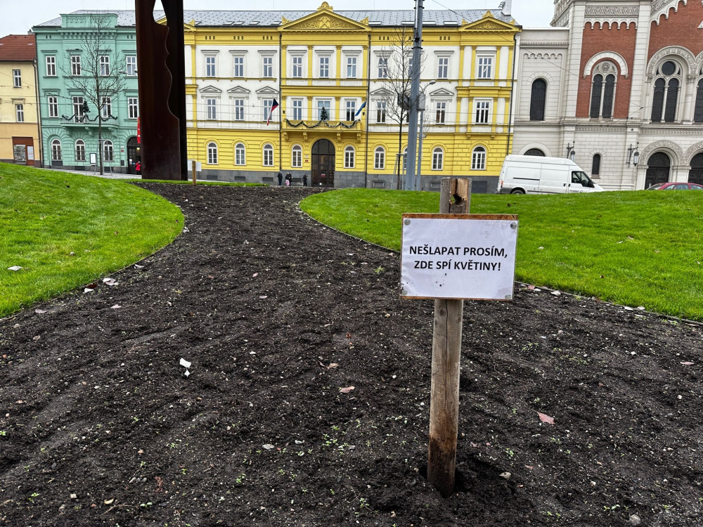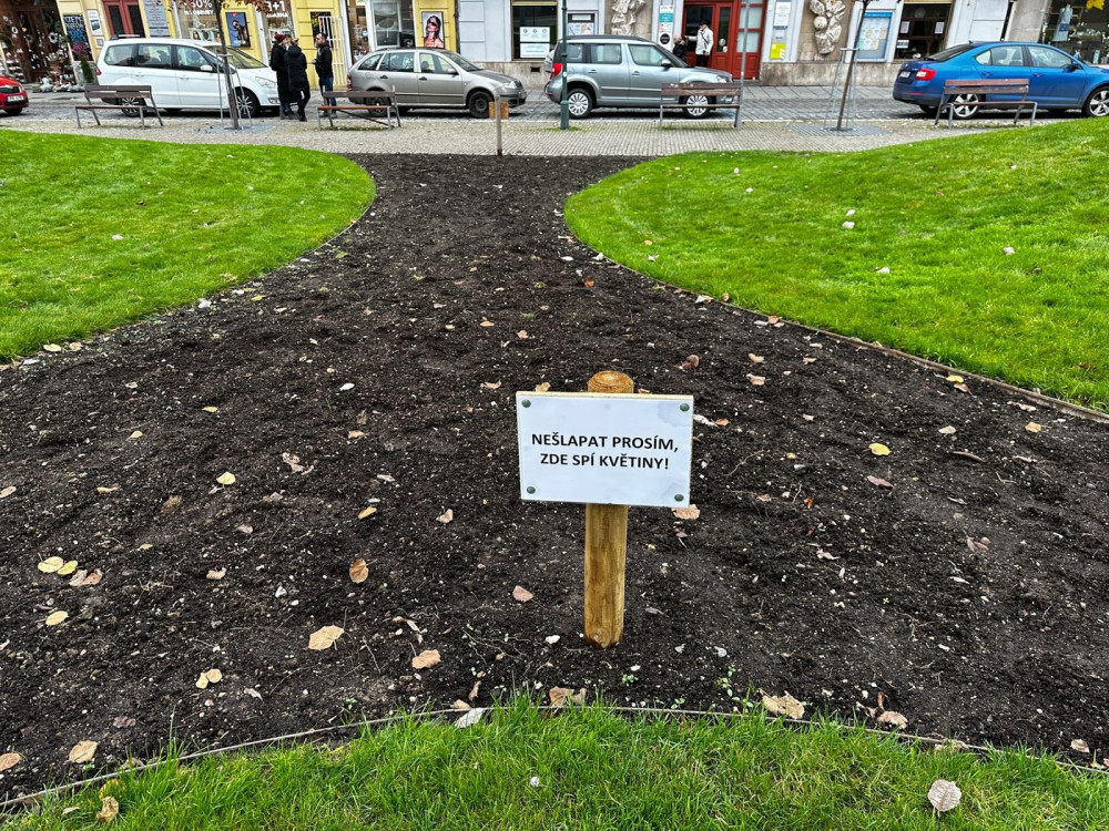 Chodci devastují záhony se zasazenými cibulovinami opatřené cedulemi zakazující vstup. Hlínou prošla i žena na vysokých podpatcích