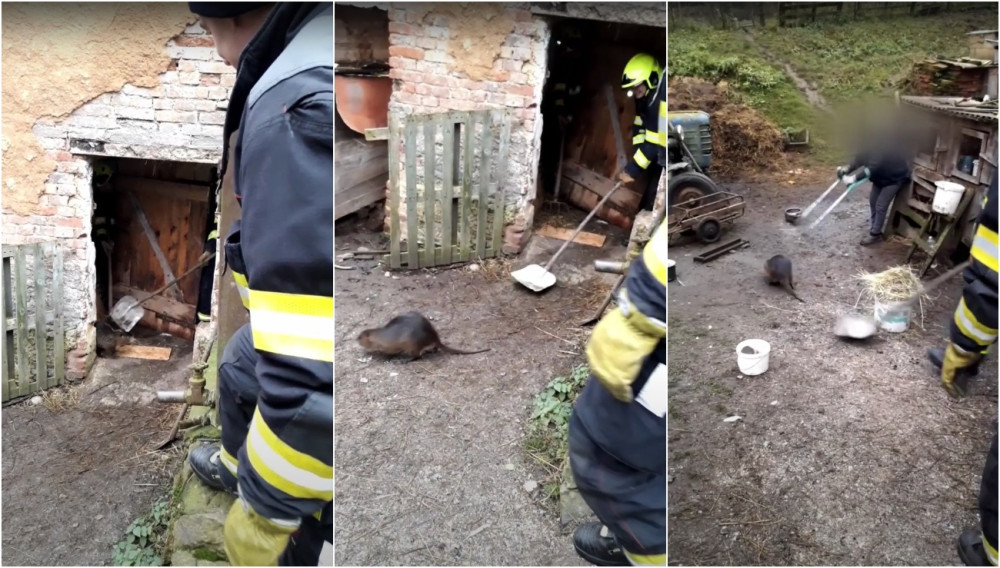 VIDEO: Hasiči svedli lítý boj s pěkně vykrmenou nutrií, dveře od chlíva jim posloužily jako štít