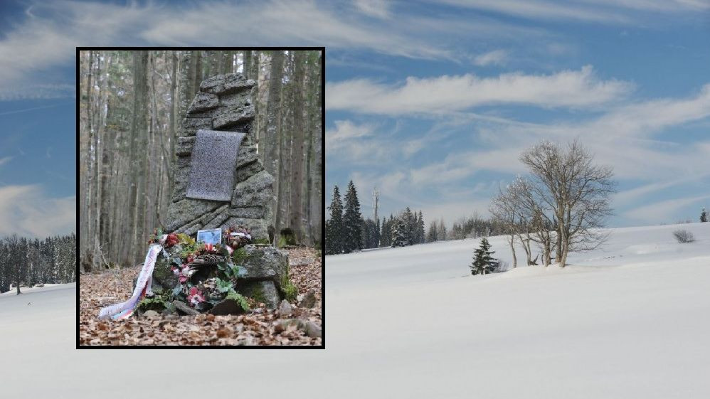 Huťská hora a památník připomínající tragickou štědrovečerní leteckou nehodu na Šumavě
