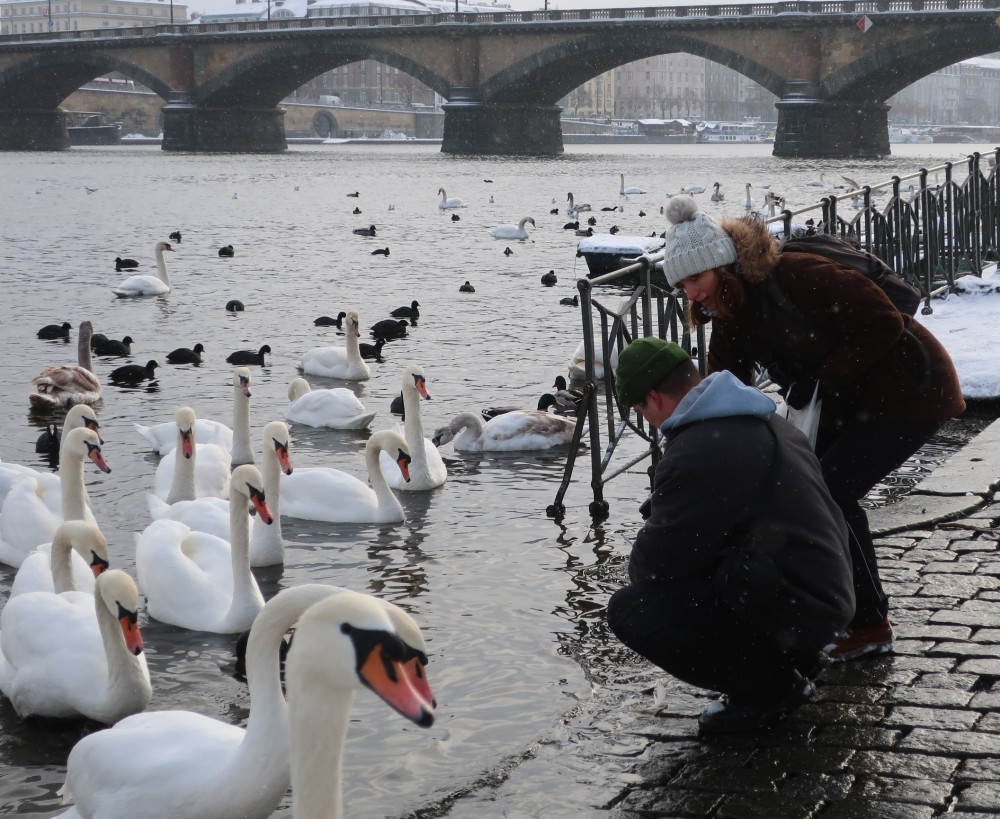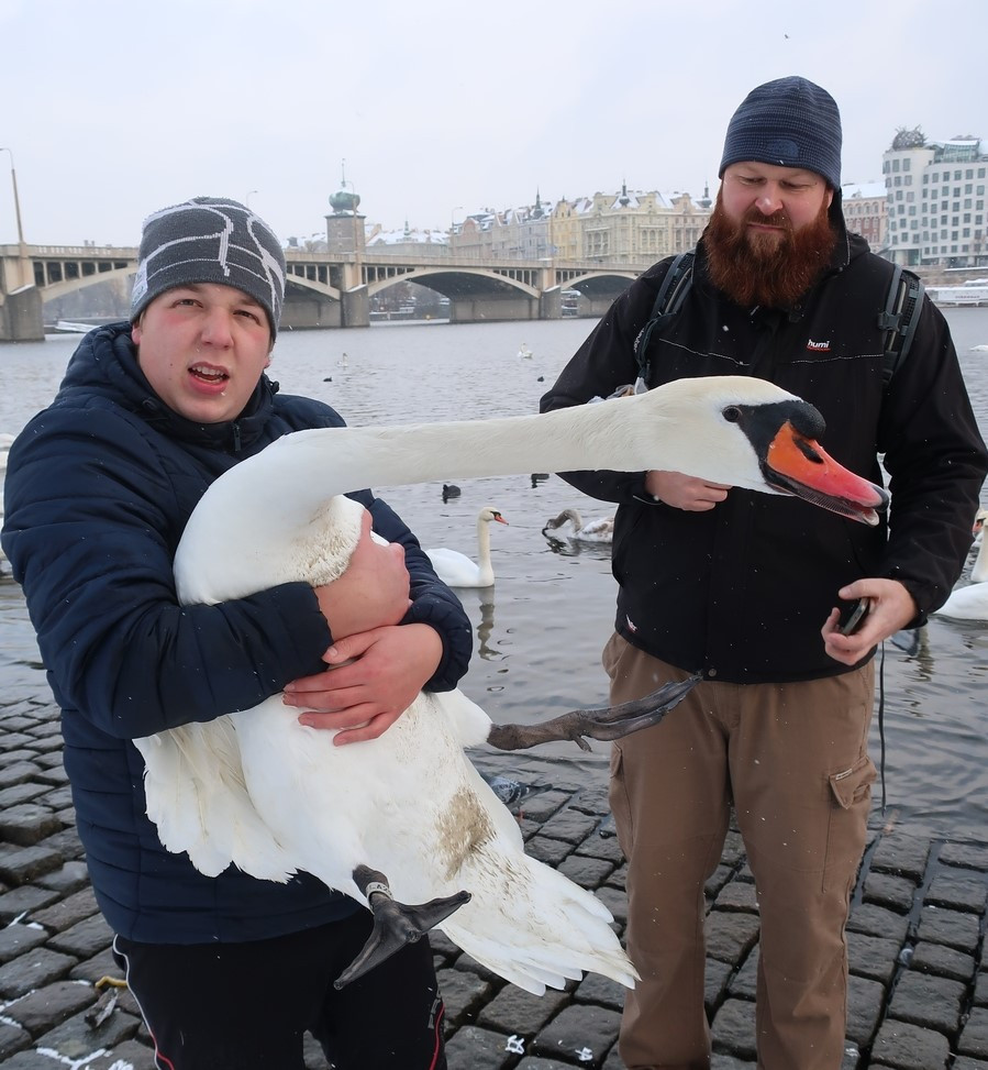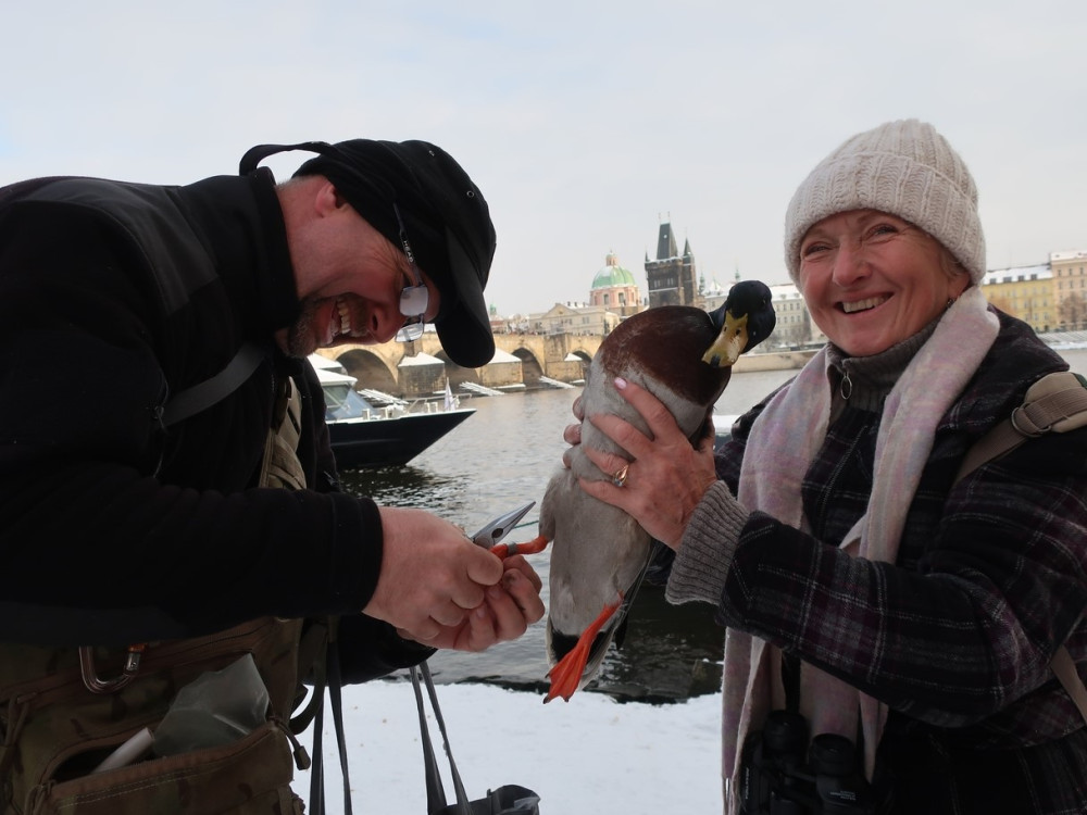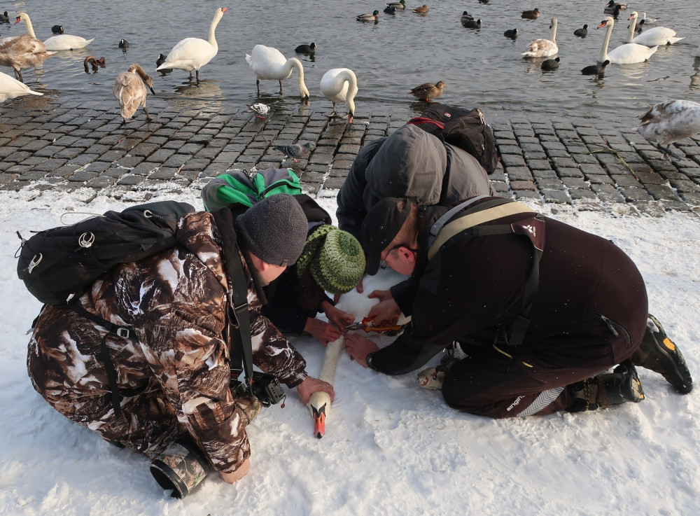 Na Vltavě v centru Prahy sčítali experti z Plzně zimující vodní ptáky, ošetřit museli i vážně zraněnou labuť