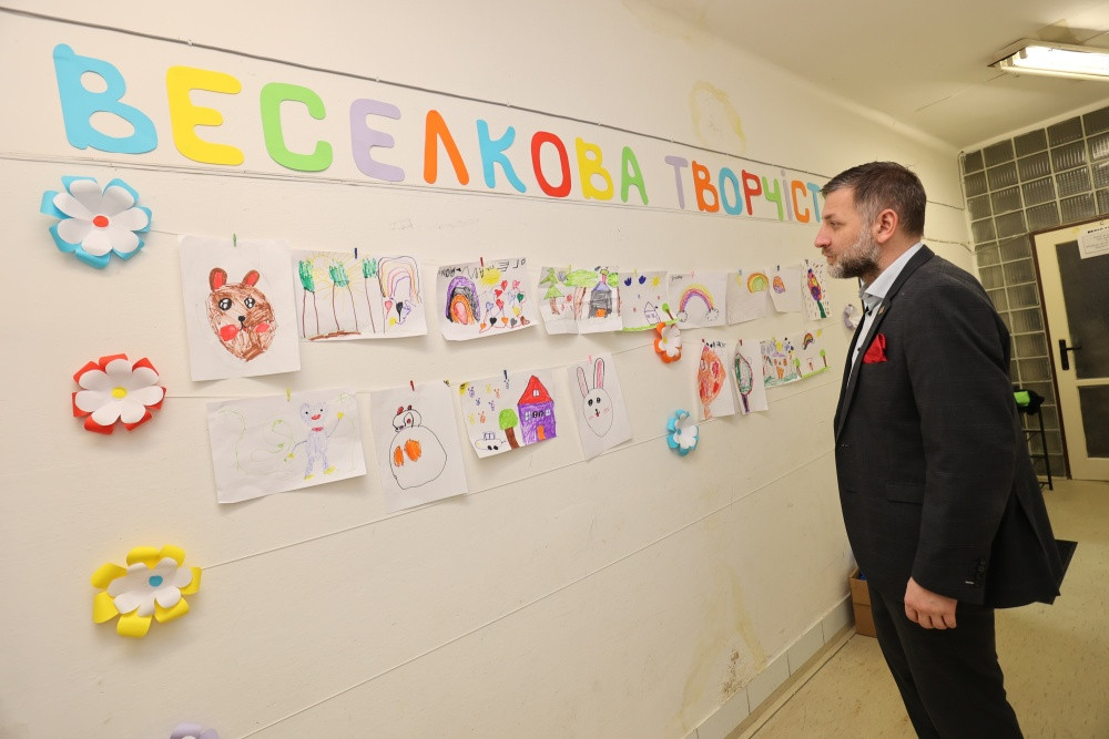 Hejtman Plzeňského kraje Rudolf Špoták si při návštěvě ubytovny a komunitního centra prohlédl obrázky dětí ukrajinských uprchlíků