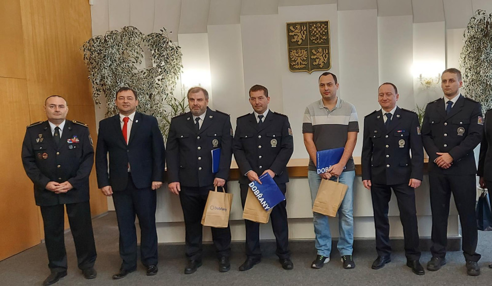Ocenění policisté se starostou Dobřan a se svými nadřízenými