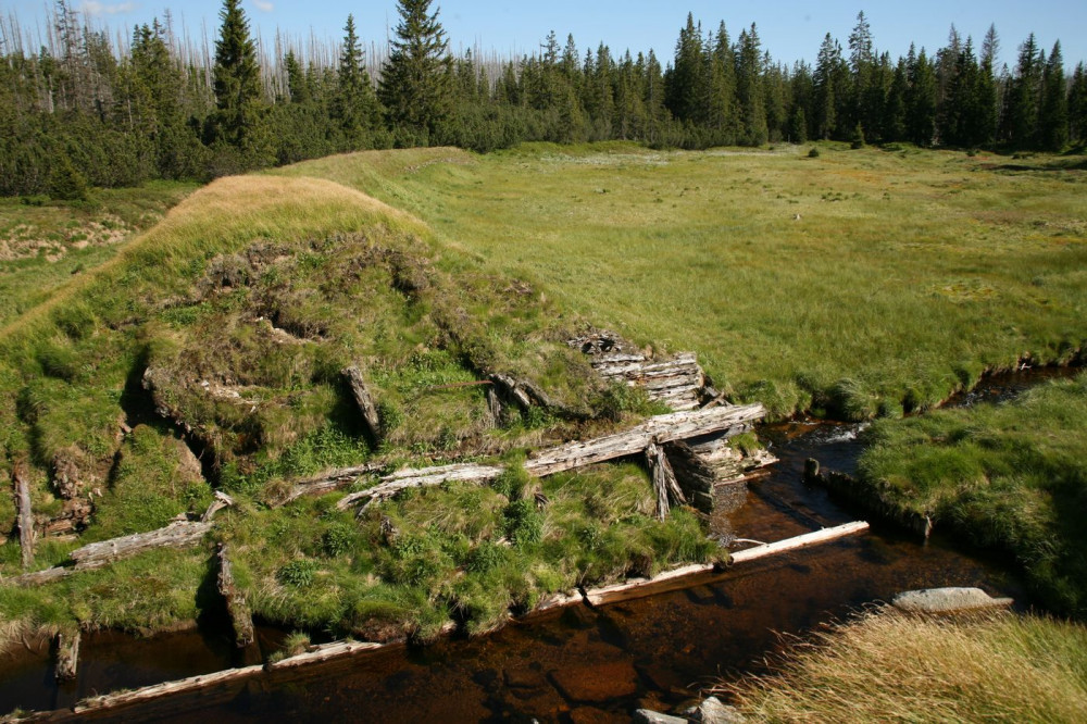 Protržená hráz vodní nádrže u Roklanské chaty