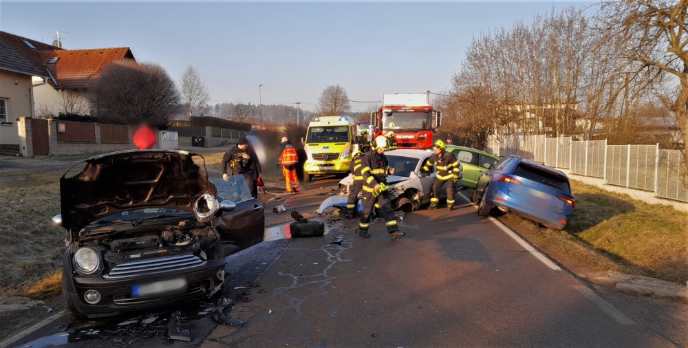 Hromadná nehoda čtyř osobáků ochromila provoz ve Starém Plzenci, na místě zasahovali hasiči i záchranáři