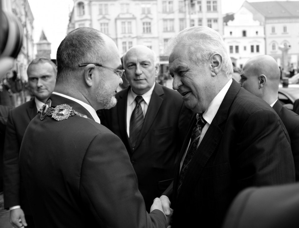 Rok 2015, bývalý primátor Martin Zrzavecký vítá prezidenta před budovou magistrátu.
