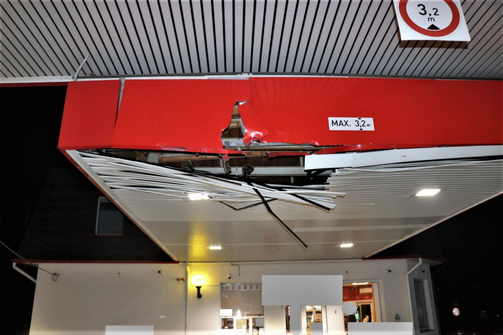 Řidič neodhadl výšku naloženého nákladu a zdemoloval střechu čerpací stanice