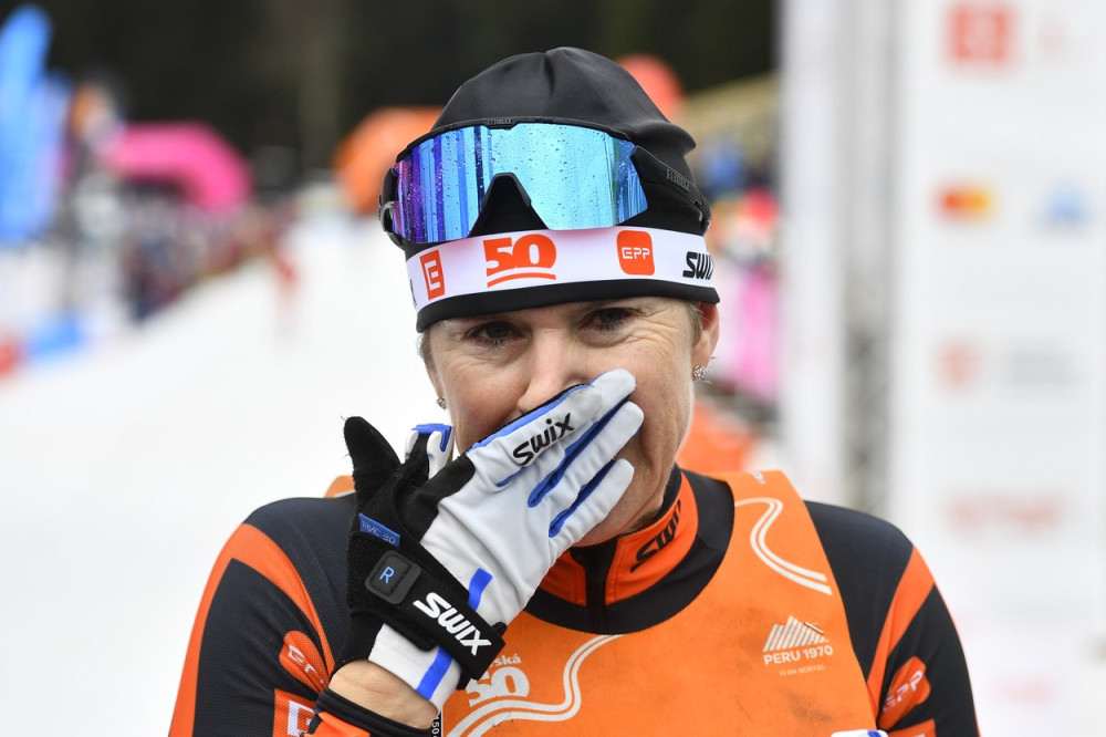 Kateřina Neumannová v cíli Jizerské 50 v únoru letošního roku.