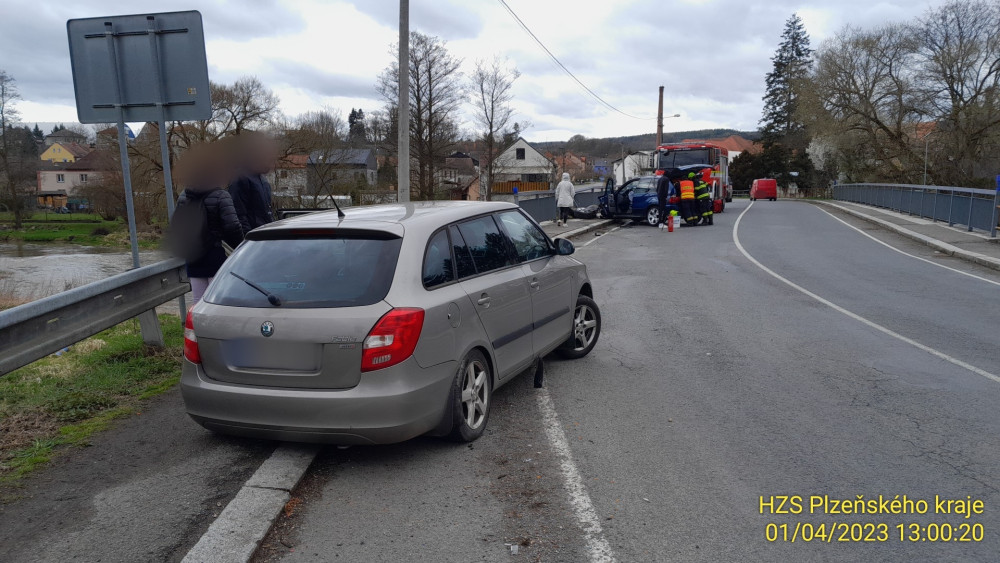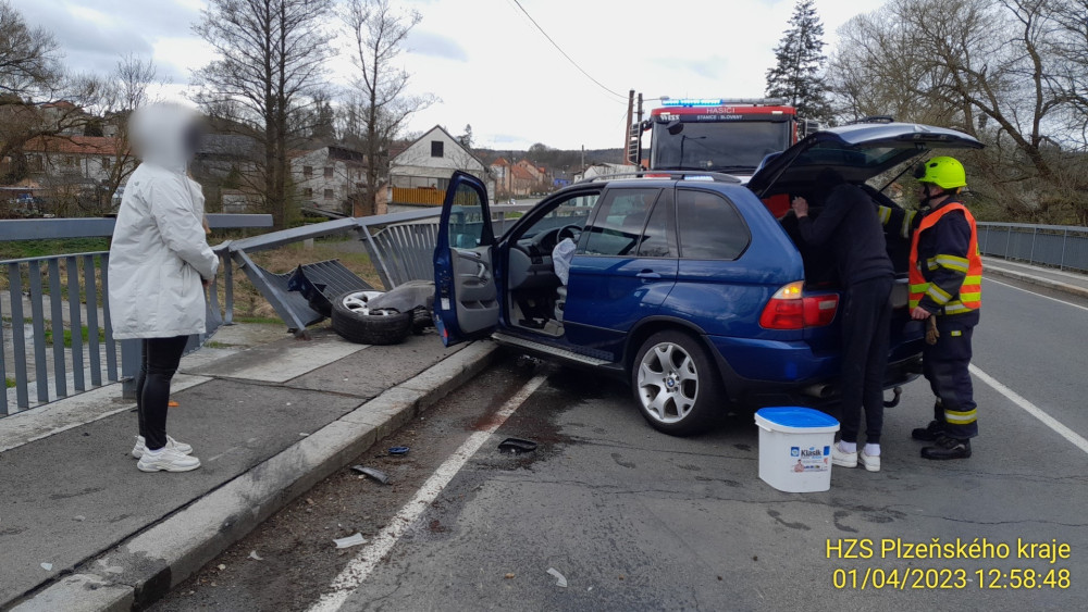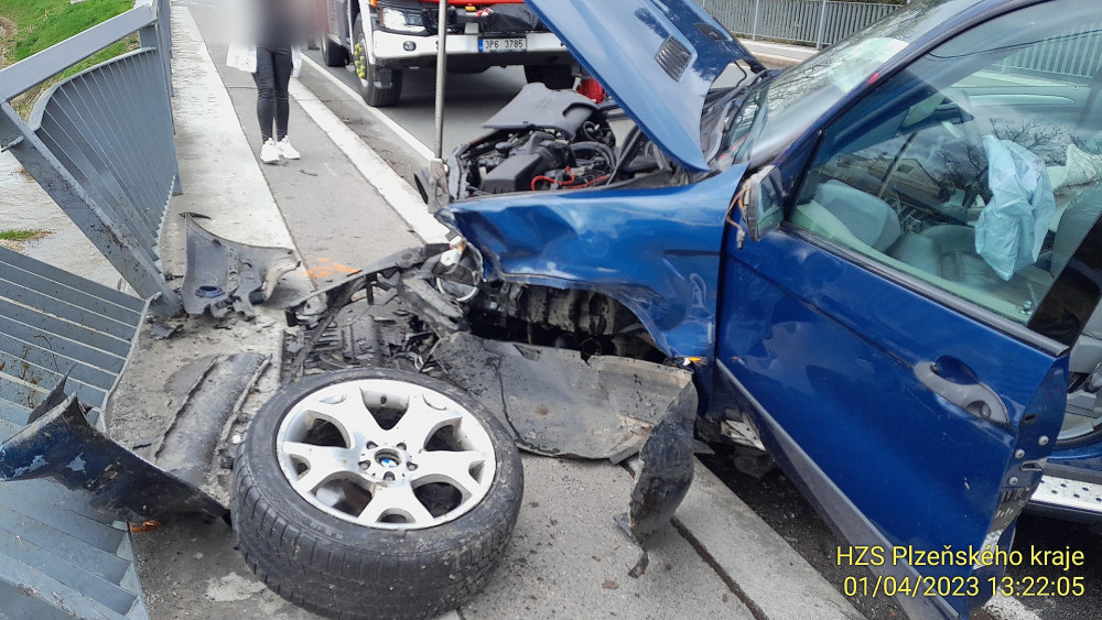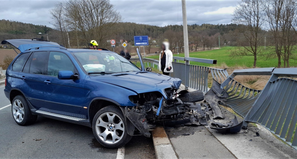 BMW vyletělo do protisměru a po střetu se Škodou prorazilo zábradlí mostu. Jen díky štěstí se nezřítilo do řeky
