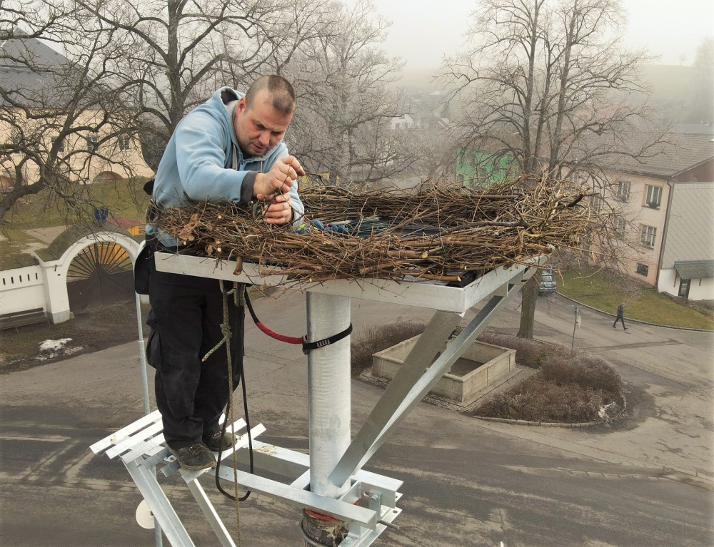 Čápi už našli v šumavské obci nově vytvořené hnízdo na sloupu. Původní se muselo kvůli bezpečnosti odstranit