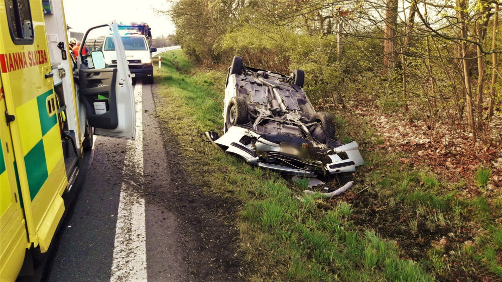 Auto vyletělo ze silnice a převrátilo se v příkopu