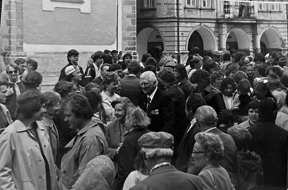 Tajně pořízená fotografie Milanem Pokorným z věže dnešní radnice v Sušici v roce 1986. Zachycuje nepovolené shromáždění občanů po příjezdu delegace z amerického velvyslanectví