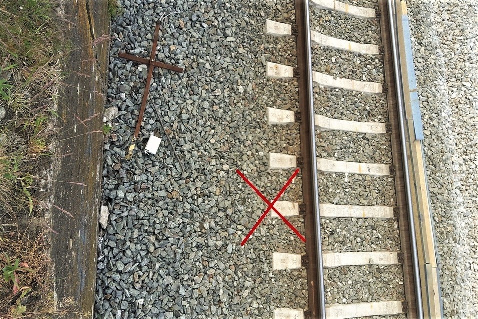 Křížek ukazuje místo, na kterém ležel muž v kolejišti v okamžiku, kdy se k němu už blížil vlak