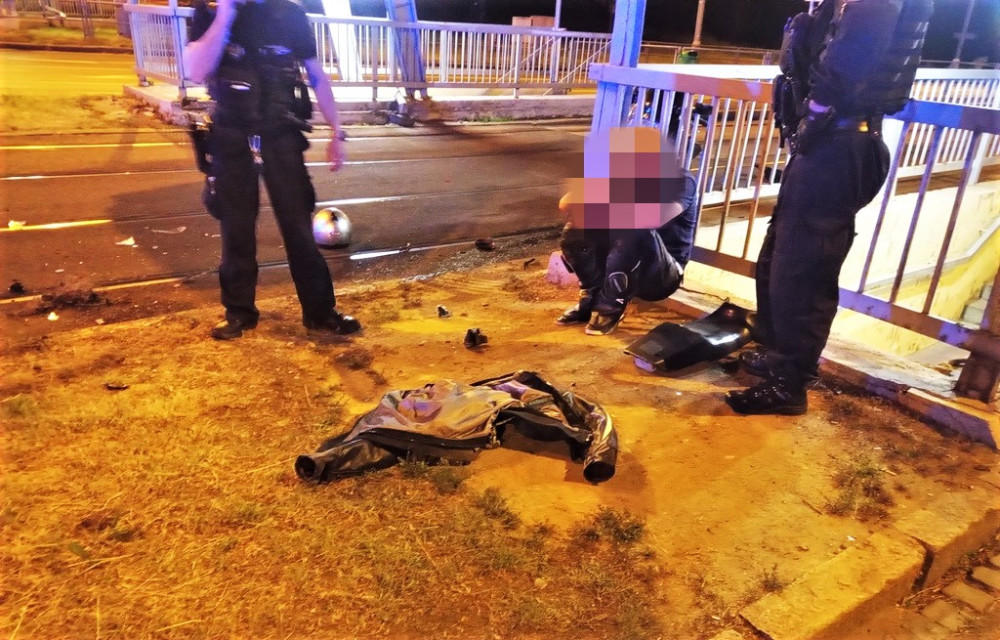 Strážníci hlídají motorkáře, který havaroval se svým strojem. Kolem leží trosky jeho motorky