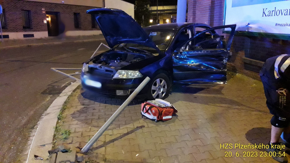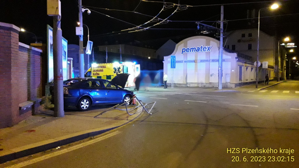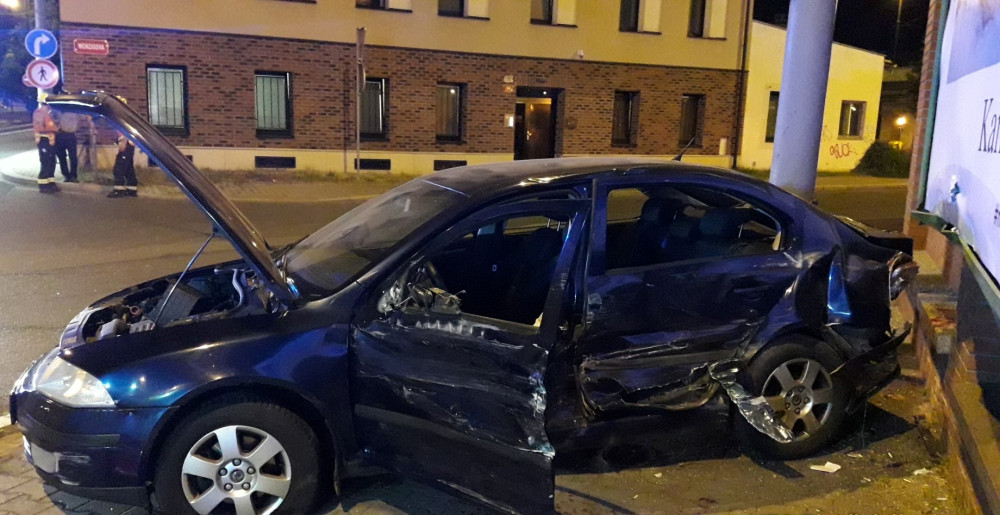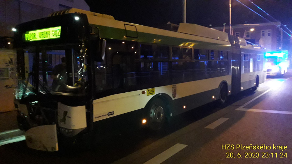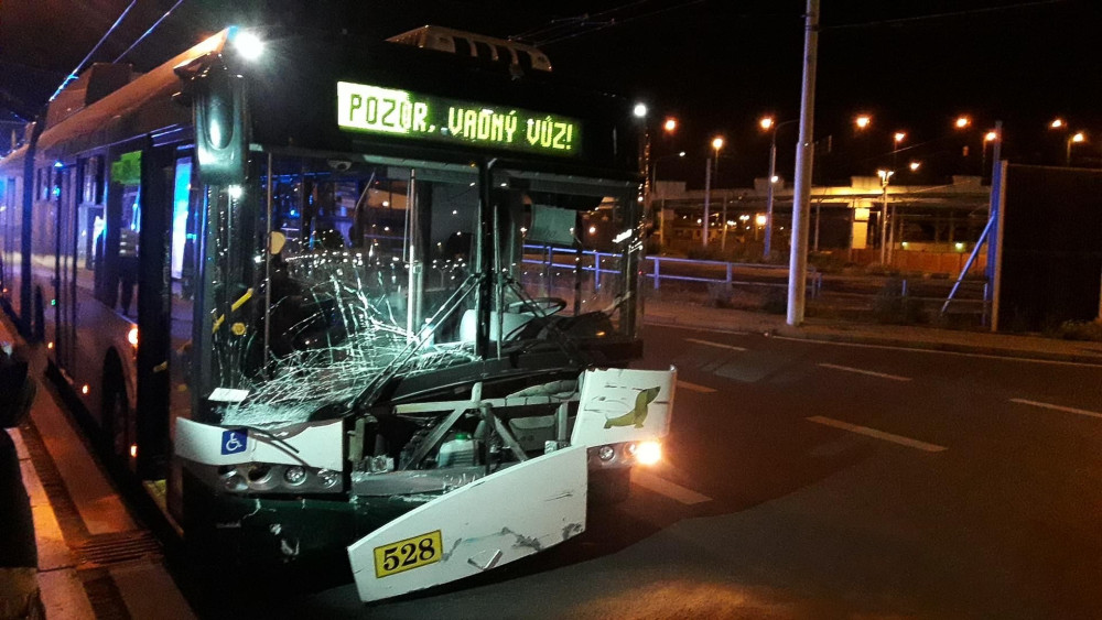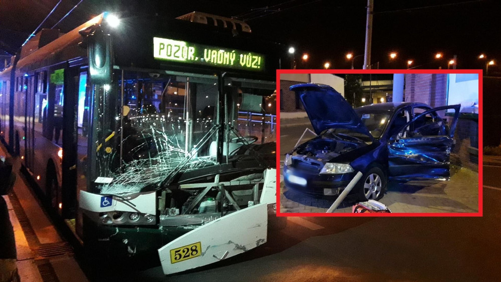 Trolejbus po střetu odmrštil osobní automobil přes chodník a zábradlí až na zeď s billboardem. Dva lidé se zranili
