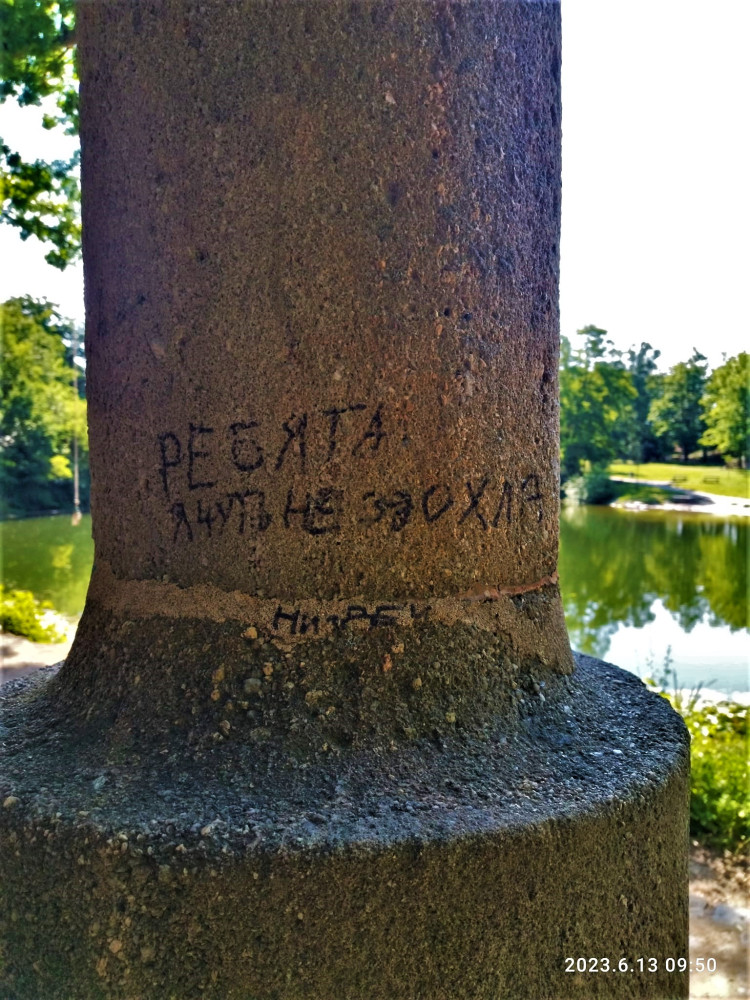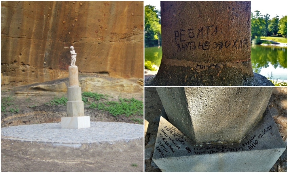 Sochu populárního andělíčka popsal neznámý vandal nápisy v azbuce. A strhla se pořádná bouře