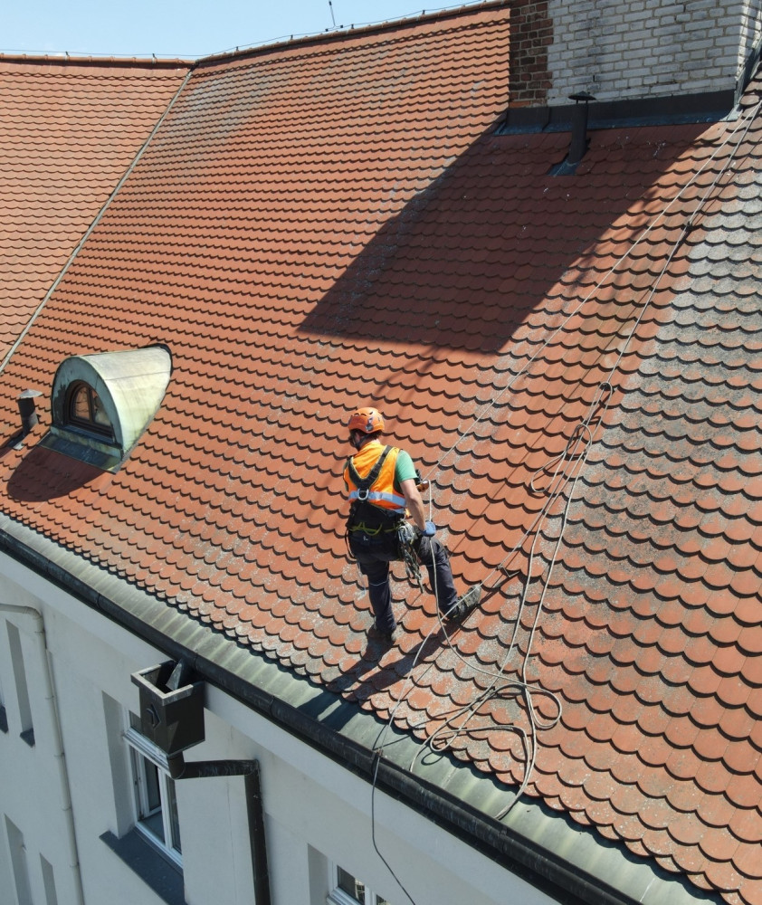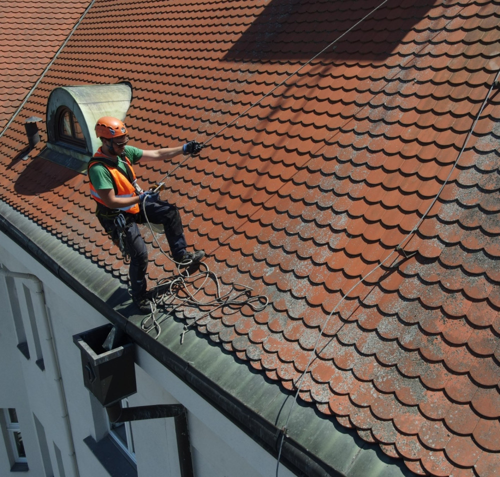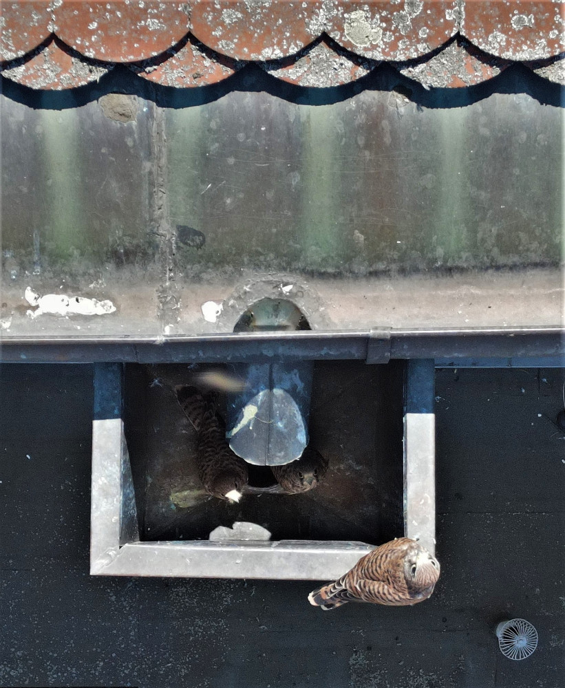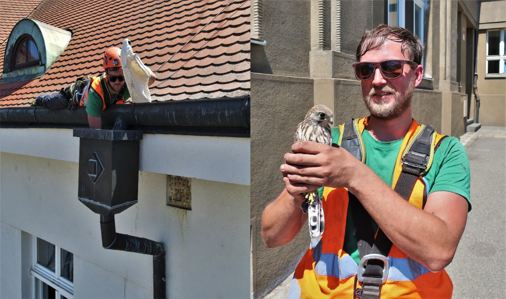 Záchrana poštolčích mláďat, která spadla do sběrače vody u okapu na jedné budově v objektu plzeňského pivovaru