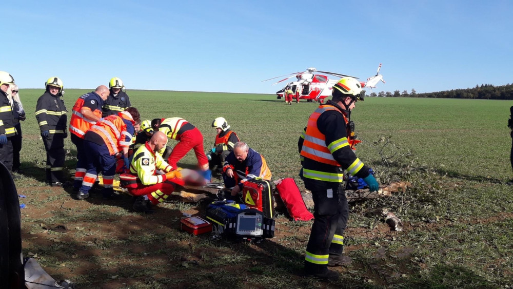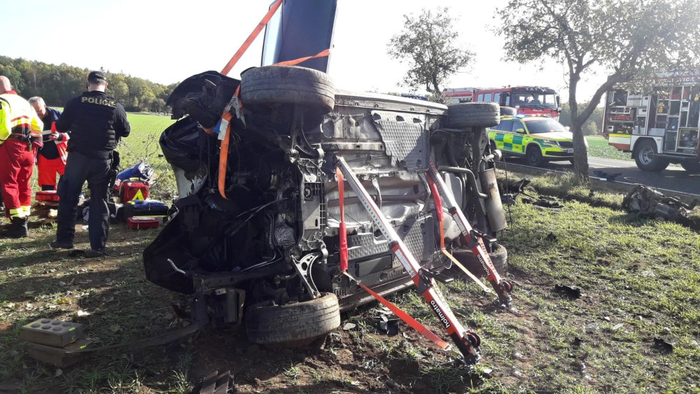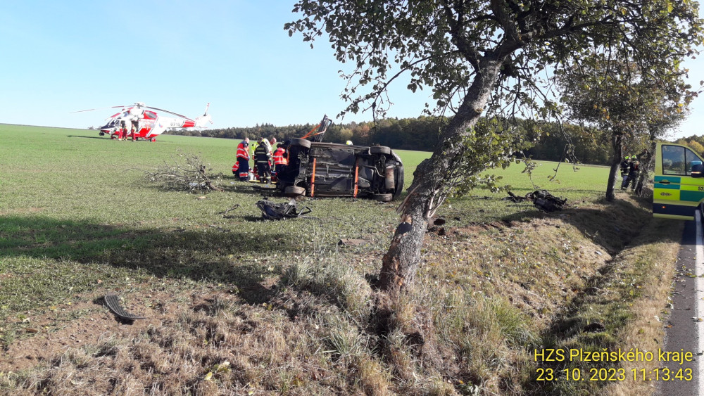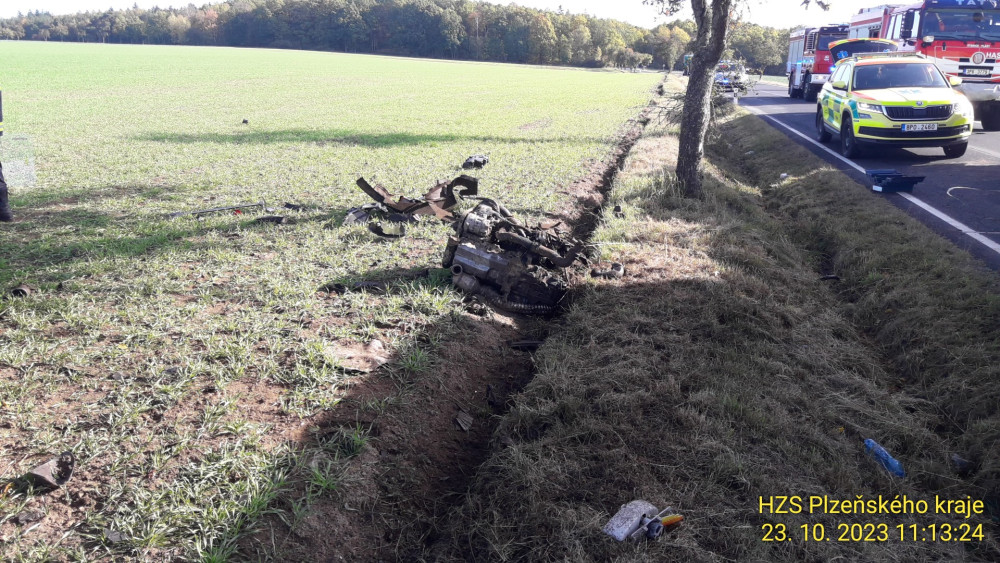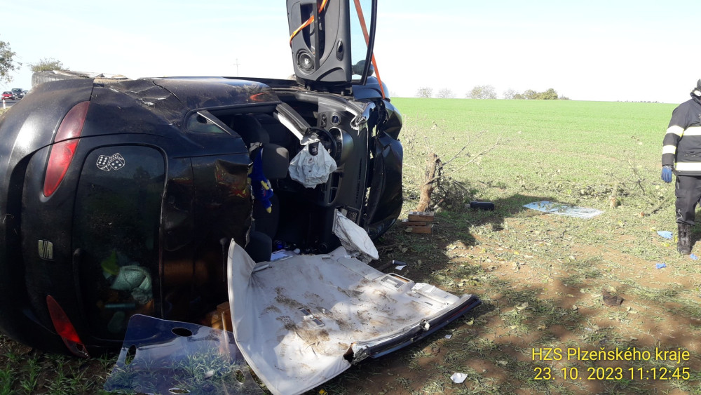 Auto vyletělo ze silnice na pole, kde zůstalo převrácené na střeše. Nárazem vytržený motor skončil za příkopem