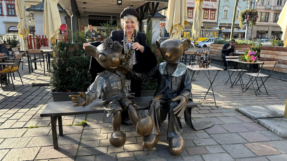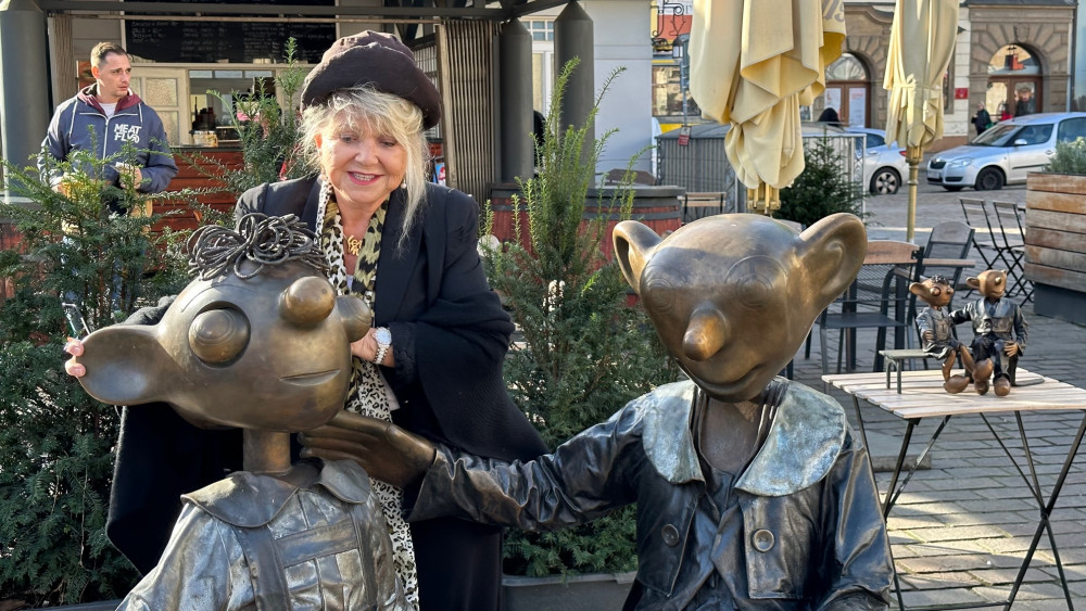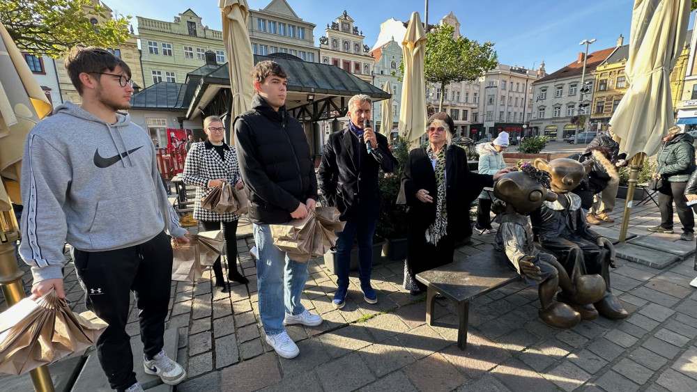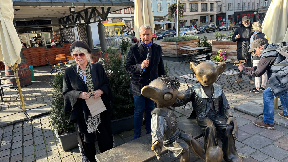 Na náměstí se vrátilo opravené sousoší Spejbla s Hurvínkem. Dostavili se i oba pachatelé, kteří Hurvínka připravili o hlavu. Vlevo Mirek s Jonášem