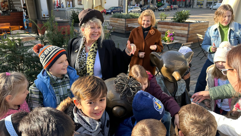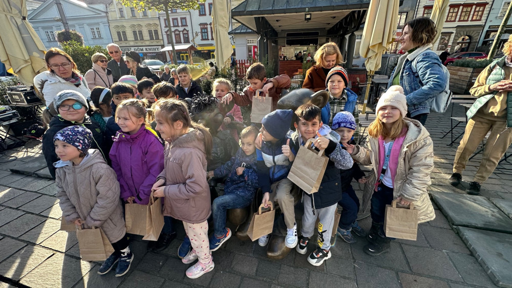Opravené sousoší okamžitě obklopily děti společně s autorkou