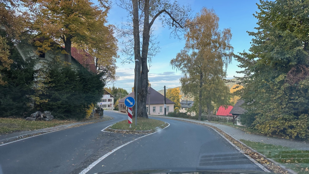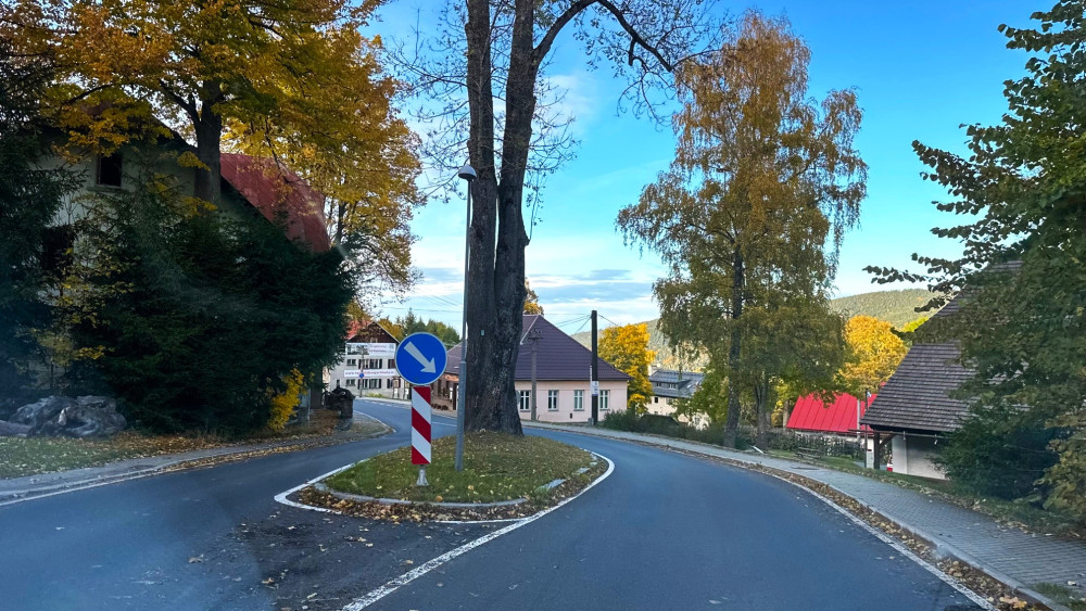 Uprostřed šumavské silnice vyrůstá z ostrůvku chráněný jasan, který nelze pokácet. Některým řidičům to vadí