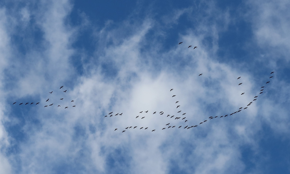 Obrovská hejna velkých jeřábů v těchto dnech létají s hlasitým troubením po obloze a míří do teplých krajin