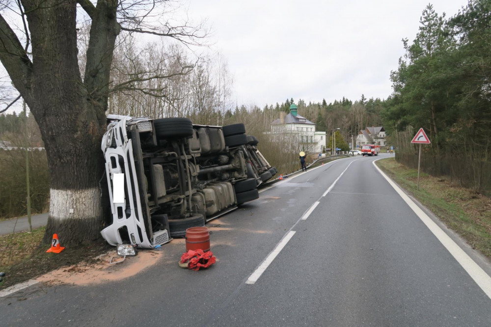 Kamion se převrátil na bok v obci Babylon na Domažlicku a následně narazil do stromu