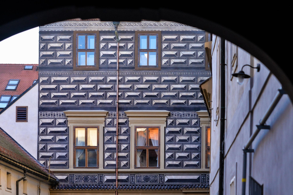 Vnitroblok plzeňského magistrátu má opravenou sgrafitovou výzdobu. Použila se historická technologie