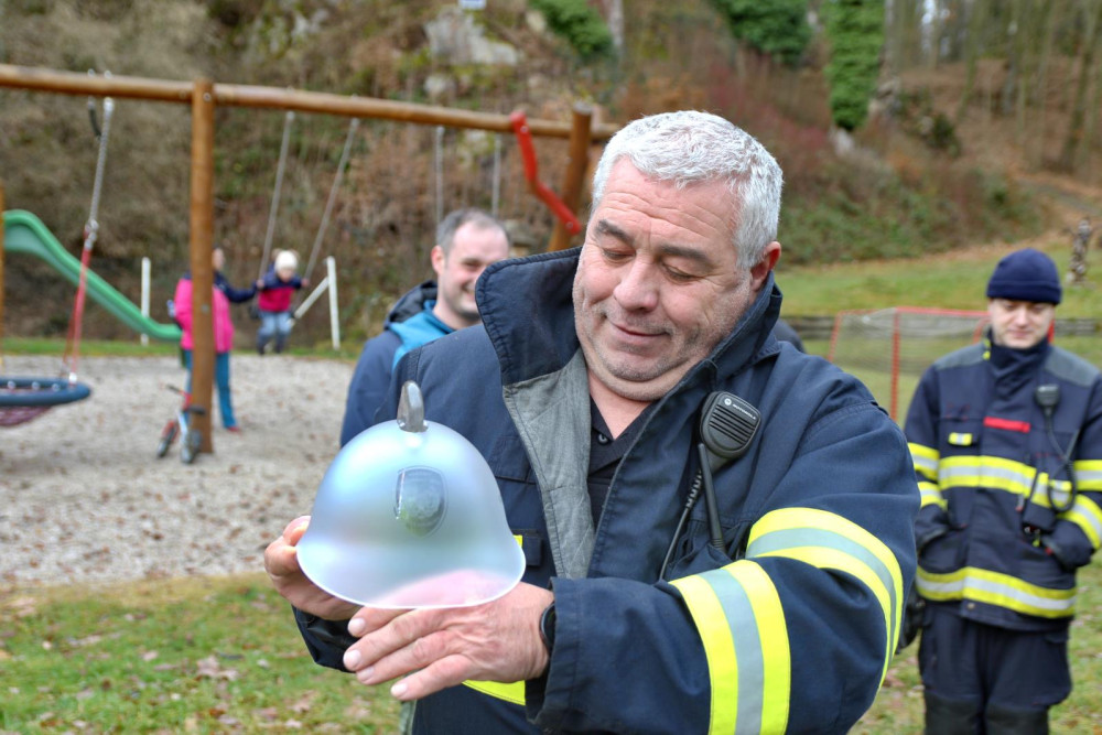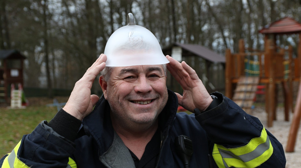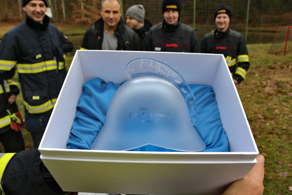 Na památku dostal Václav Pech od svých kolegů skleněnou hasičskou přilbu.