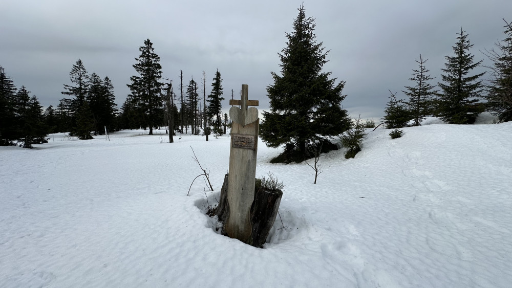 Toto prkno na vrcholku hory Svaroh připomíná krále zmizeé Šumavy Emila Kintzla