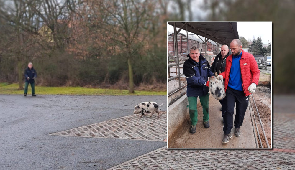 Hasiči spolu se starostou naháněli zaběhlého strakatého čuníka, lapili ho na hřbitově do volejbalové sítě