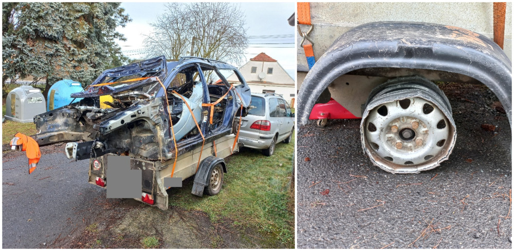 Za vozíkem s nadměrným nákladem sršely jiskry, chybějící pneumatika nebyla jediným řidičovým problémem