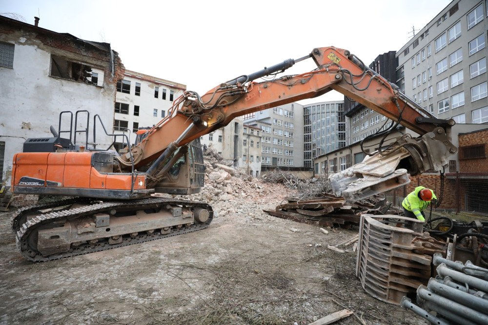 Těžká technika začala s demolicí ve vnitrobloku zchátralých lázní, kraj si na jejich obnovu vezme dvoumiliardový úvěr