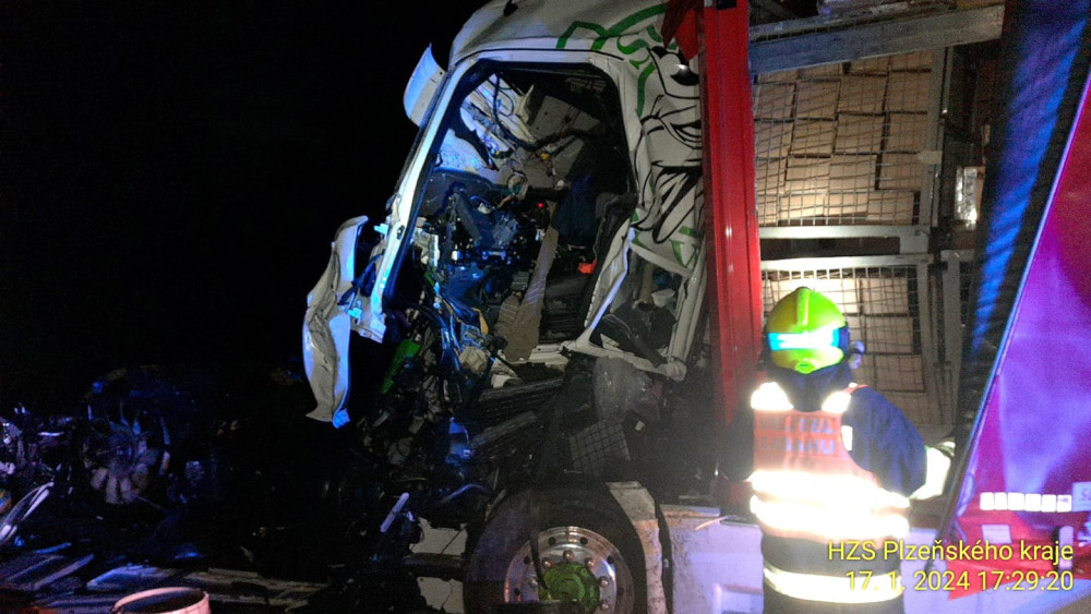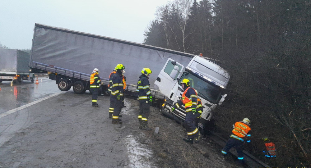 FOTO: Černé předpovědi o kluzkých silnicích se naplnily. Při nehodách kamionů se těžce zranili dva řidiči