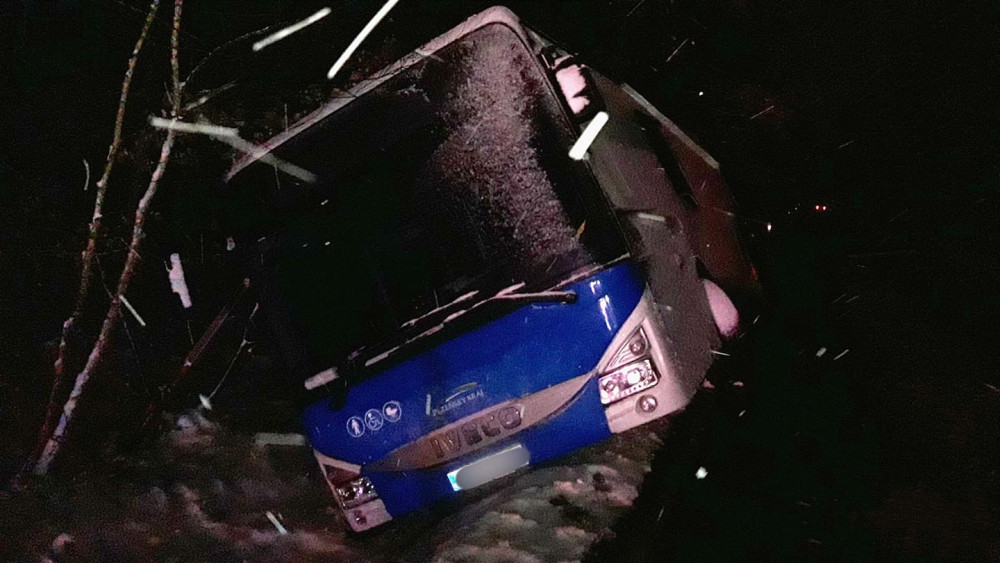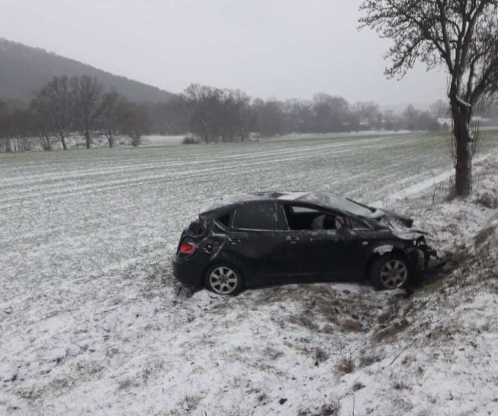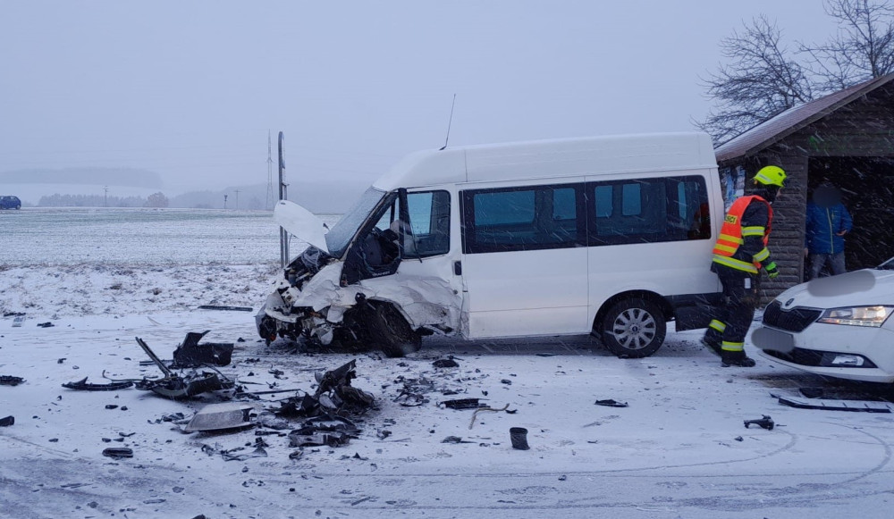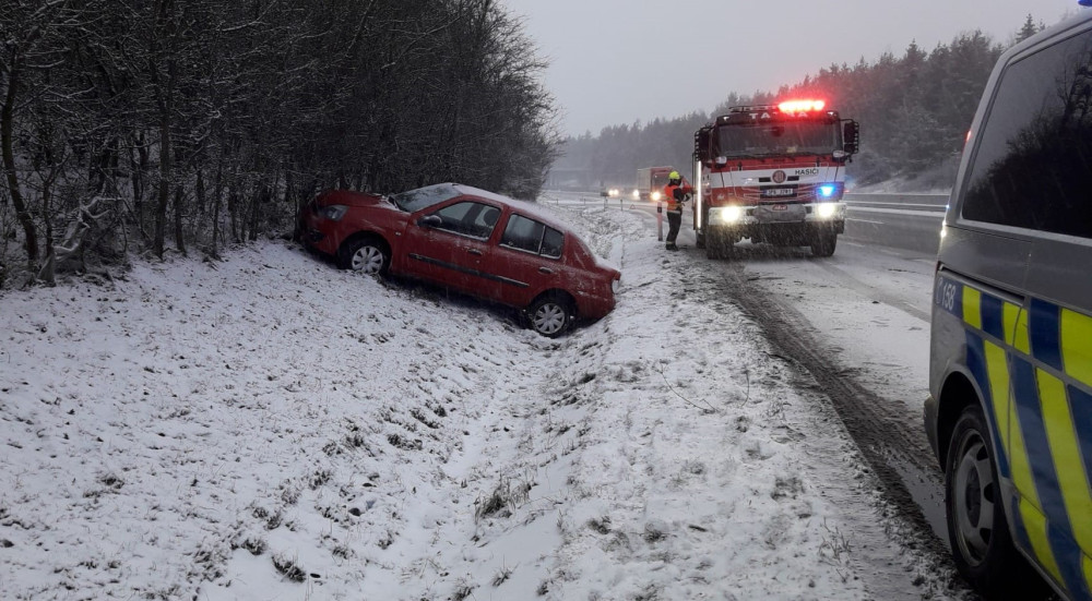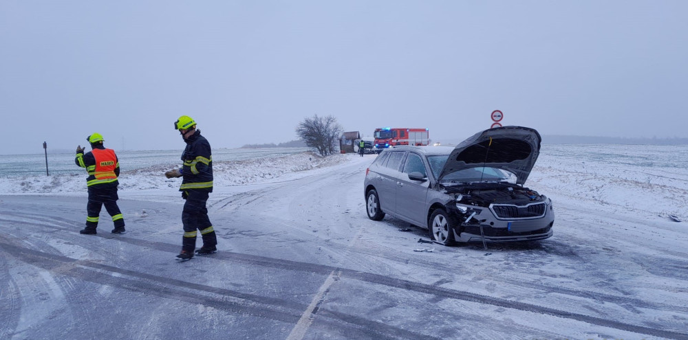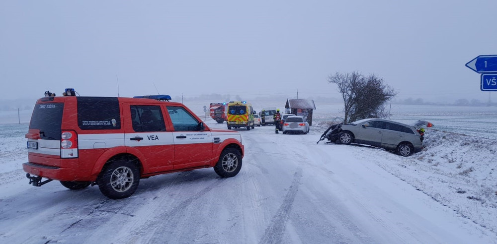 Hromadná nehoda čtyř automobilů na zasněžené silnici blokuje hlavní tah z Plzně na Karlovy Vary. Na místě jsou zranění