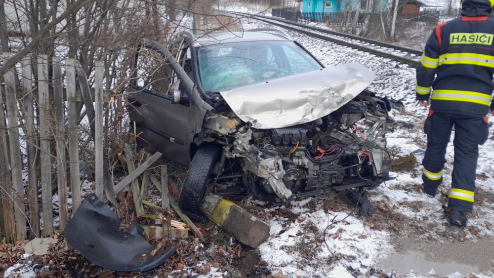 Vlak smetl na železničním přejezdu osobní automobil. Náraz odmrštil zdemolovaný vůz až na plot zahrady