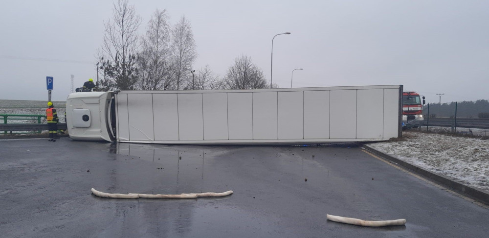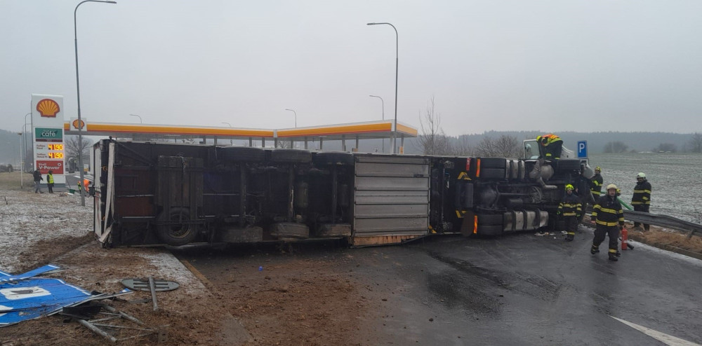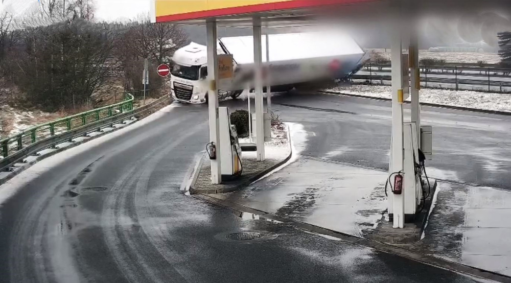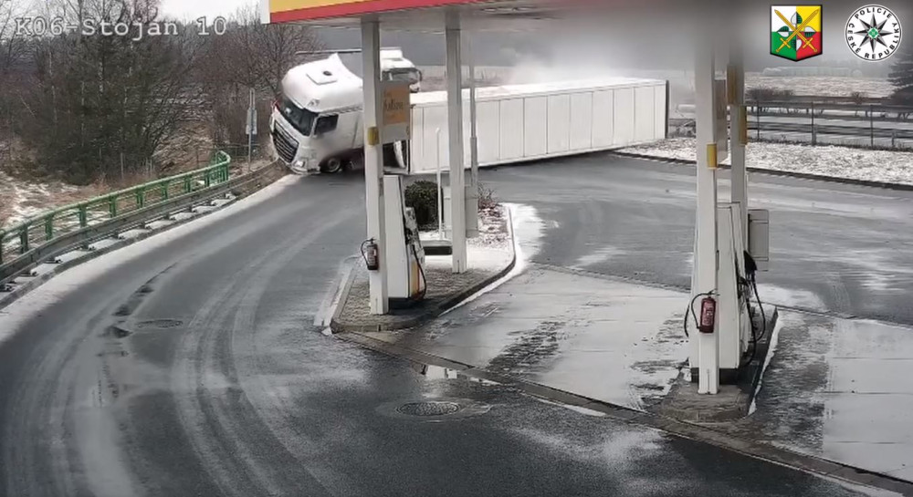 Video zachytilo nehodu kamionu, který se na ledovce ve vysoké rychlosti převrátil na bok před čerpací stanicí