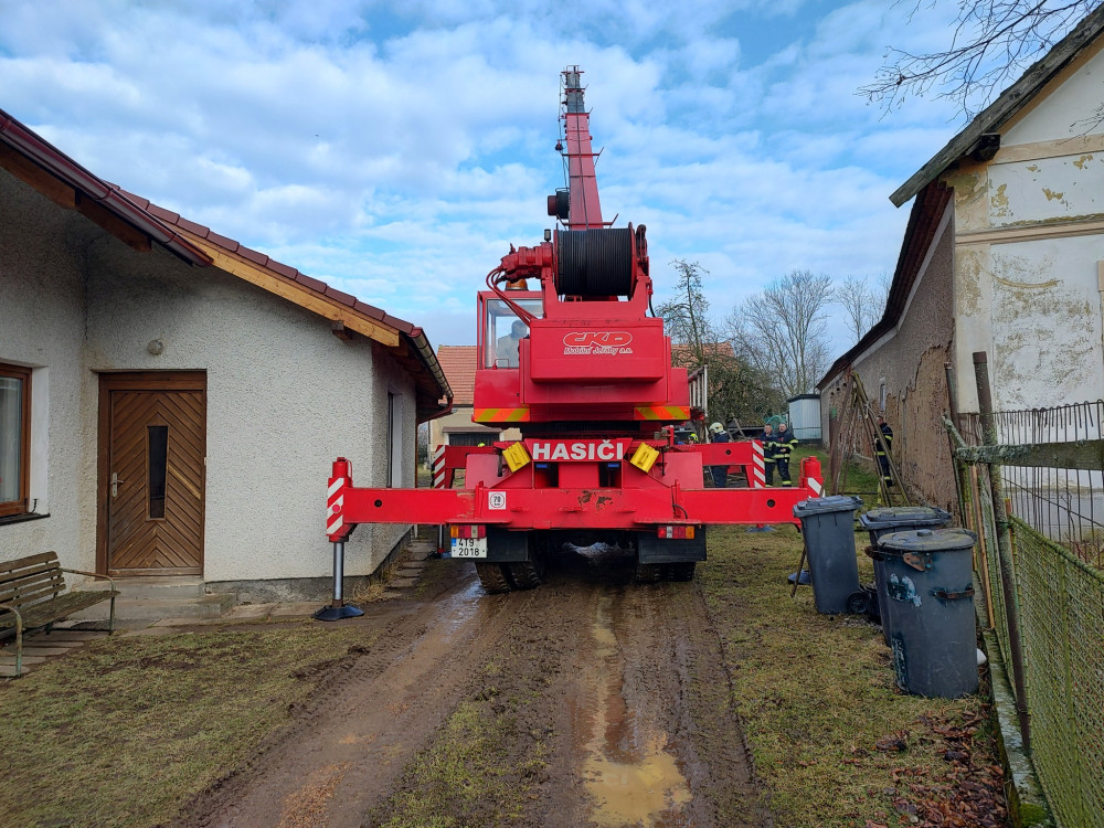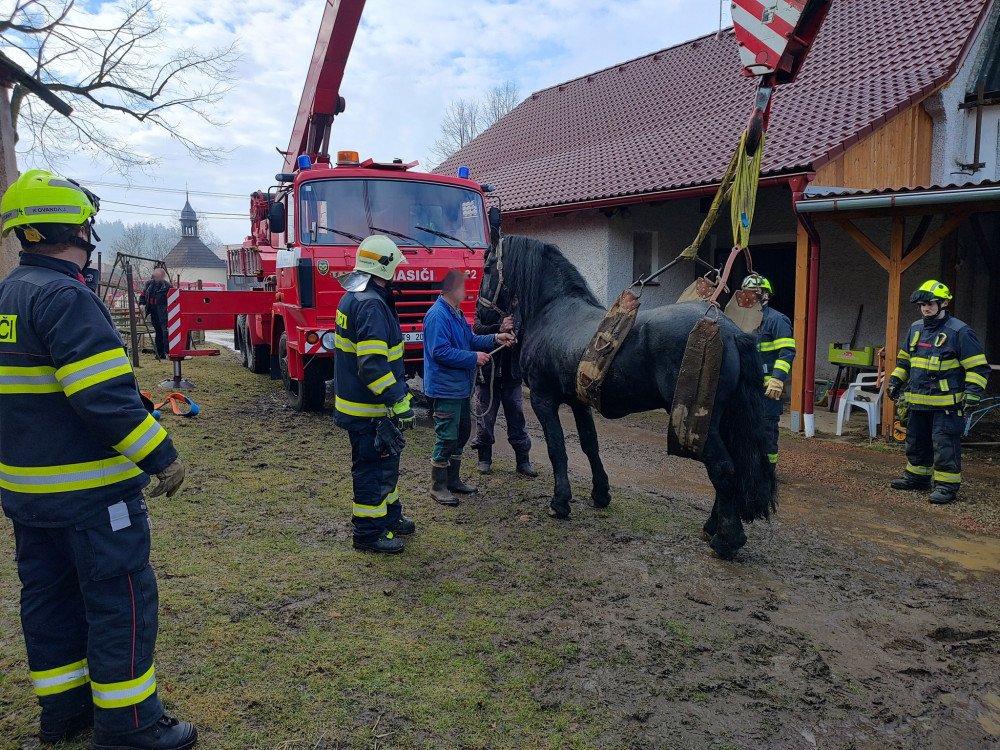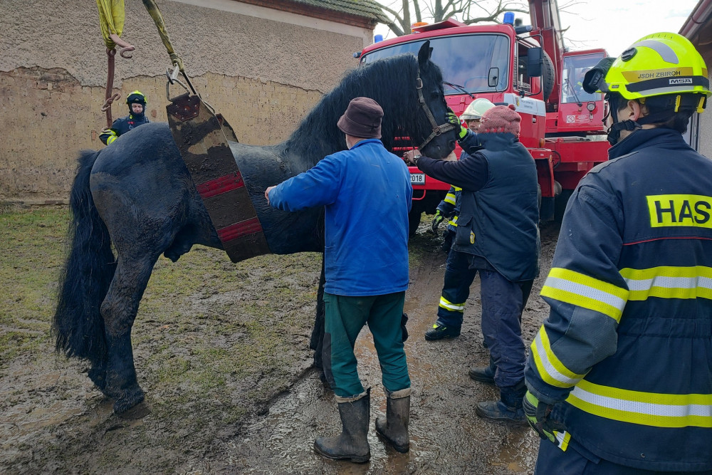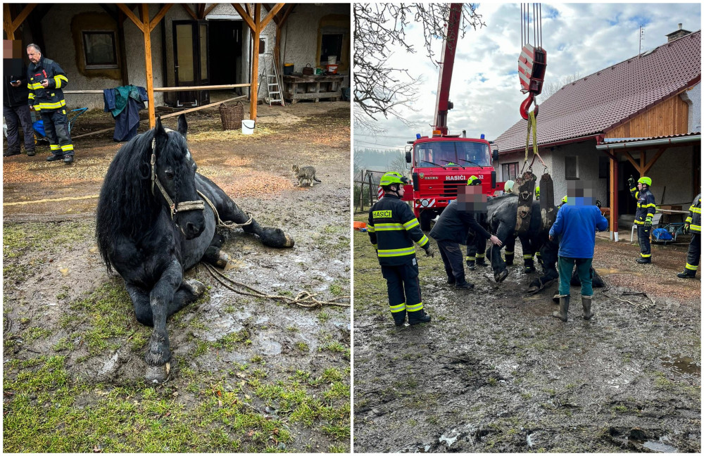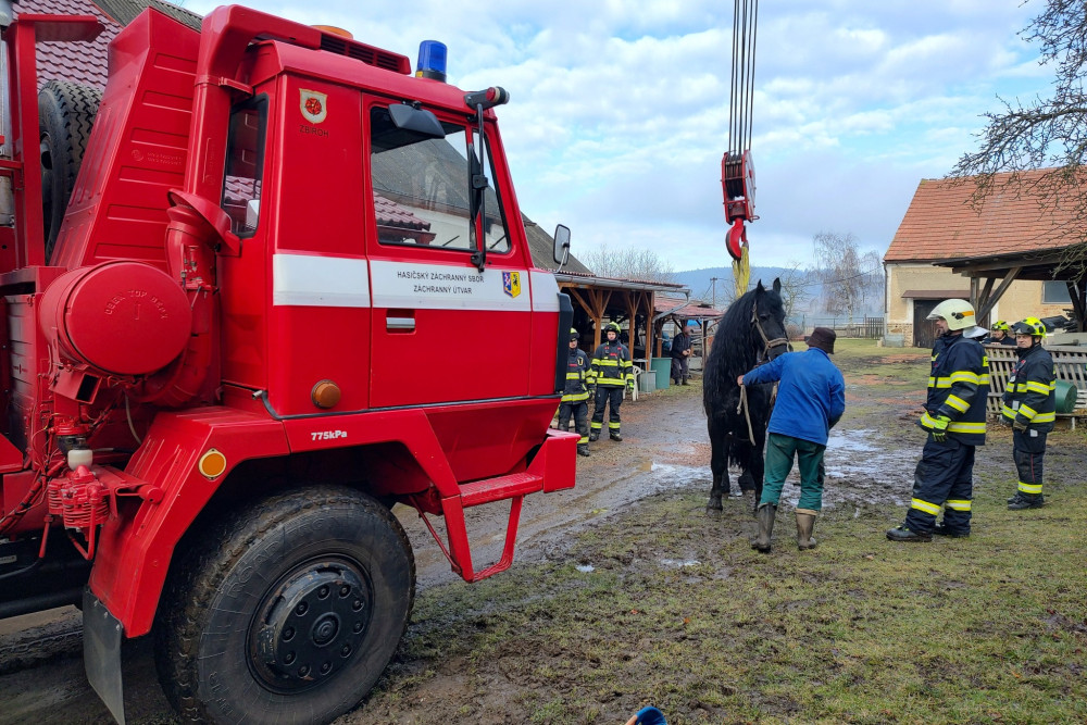 FOTO: Kůň upadl a nedokázal se sám zvednout, znovu na nohy ho postavili hasiči s jeřábem